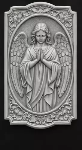 Praying angel figure sculpted in high reliefSymmetrical wings and calm facial expressionStylized symbolic human form suitable for commercial distributionDeep layered relief for strong light and shadow contrastDecorative frame enhancing protection and visual balanceIntegrated loop for chain or cord attachment