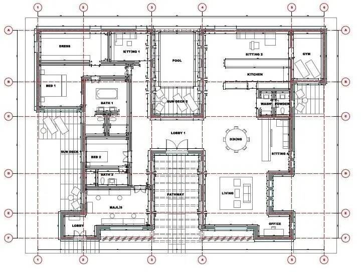 Minimum plot dimensions 30mx22mTotal built-up area455sqmVilla components:Ground Floor:• Front Garden• Lobby• Main Kitchen• Dining Area• Living Area• Multiple Sitting Areas• Guest Room and Bathroom• Powder Room• Office• Majlis• Sundeck• Pool