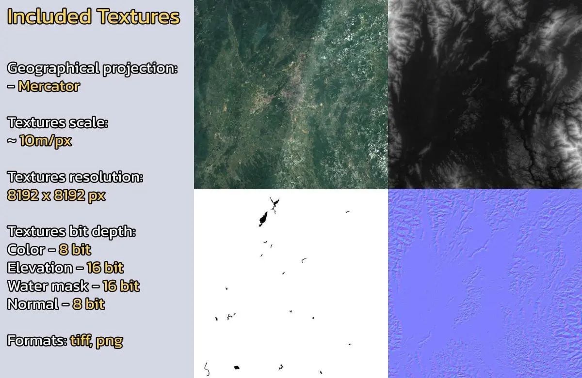 Warning: minor clouds/artifacts may be present on the diffuse color satellite texture due to the nature of the dataset. Check product images.