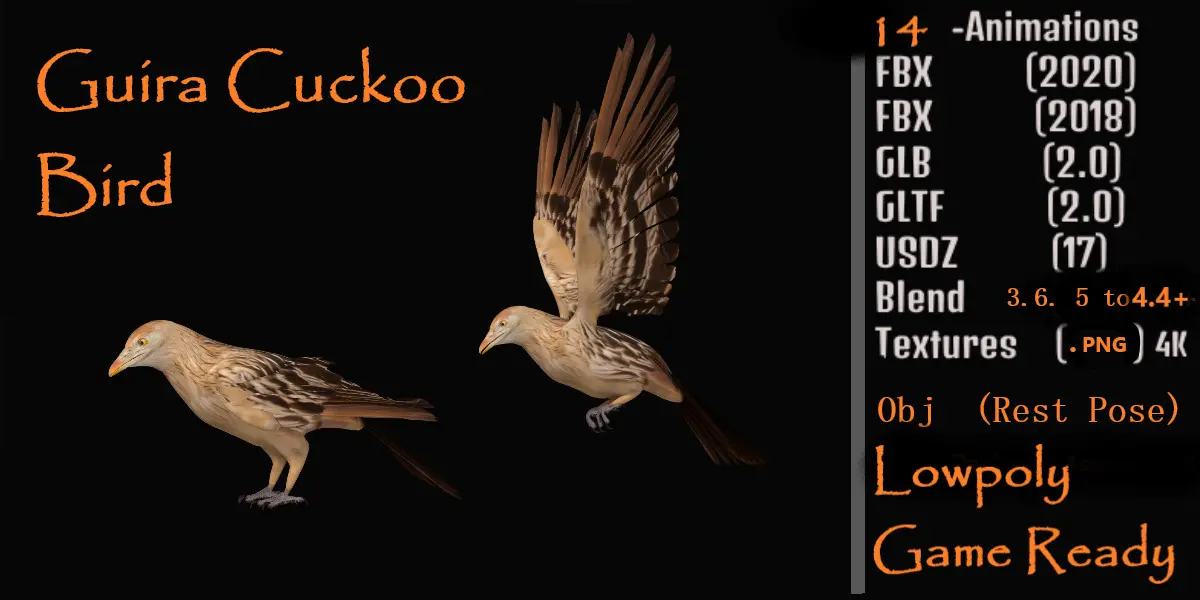 The guira cuckoo, known in Spanish as the pirincho is a species of gregarious bird found widely in open and semi-open habitats of northeastern, eastern and southern Brazil, Uruguay, Paraguay, Bolivia, and northeastern Argentina. It is the only species placed in the genus Guira..3D guira cuckoo pirincho Bird Animal Model By Nyilonelycompany (nyc).