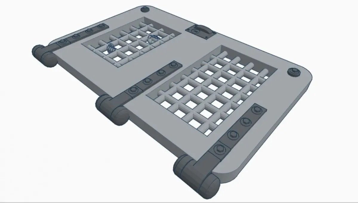 Print to 1:1 scale which will allow it to fit the back of your guitar. There are 6 hidden screw holes which a plugged by insert simulated bolts and a door lock.