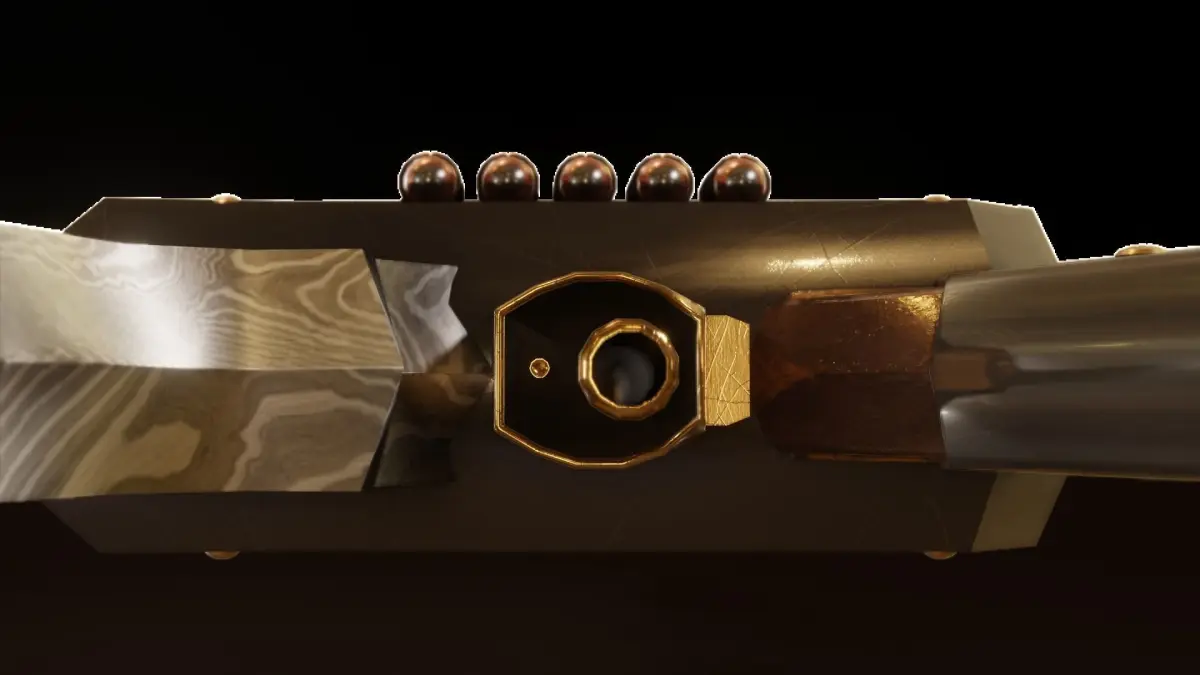 The Axe-Pistol is definitely a quite complex weapon to wield. This model was inspired by the idea of having a magnificent close quarters weapon being quite letal in many ways: the main cutting blade is made of Damascus steel which once sharpened to its peak is capable of slashing very hard surfaces; on the opposite side sits a toothed blade that can efficiently slash through any organic material with ease; at the bottom of the weapon the spike can be used to pierce which is an advantage depending which foe you are facing, especially while hunting; last but not least, its crown jewel - a long cane pistol (much as a rifle barrel) capable of firing a high powered shot once needed. The weapon also has extra bullet slots made of silicone for those moments that you know you'll need to go guns blazing towards victory!