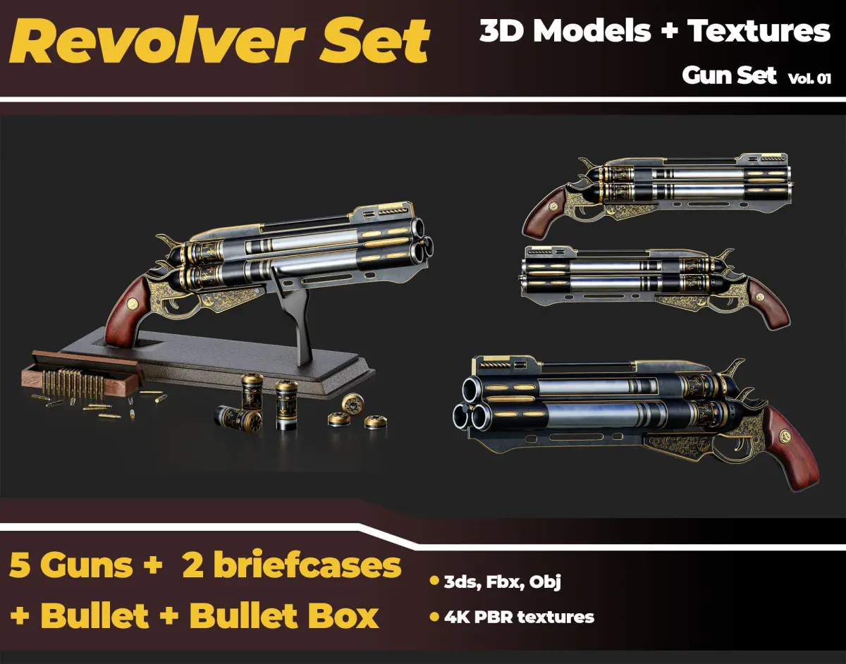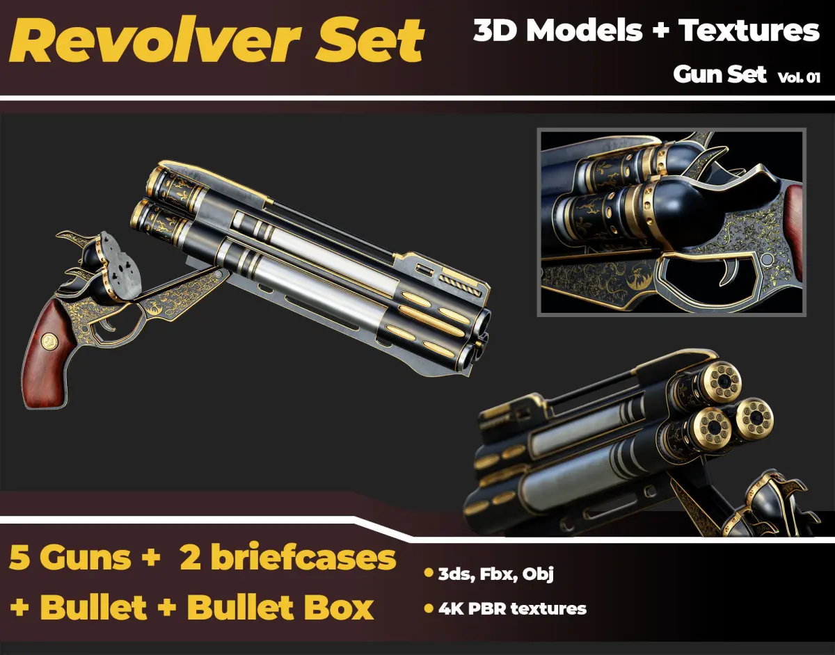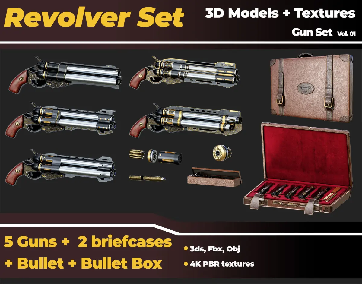 5 Realistic Revolver Guns, 2 realistic leather briefcases, 1 bullet, 1 wooden bullet box 3D Models with 4K PBR Textures | High poly | Vol 01