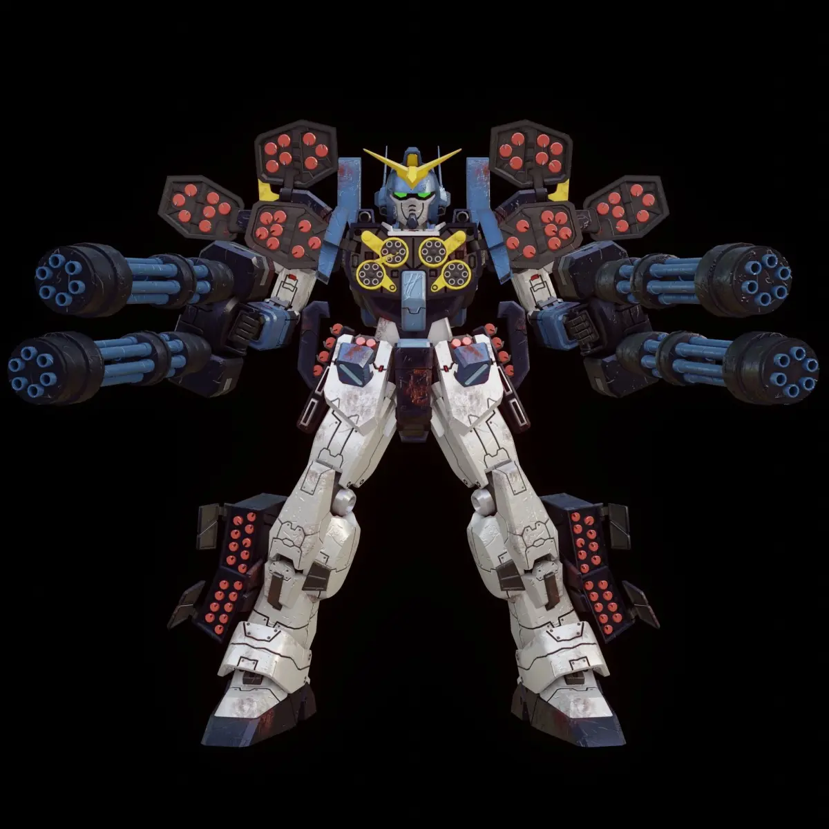Gundam fanmade from me, Made for game Assets or Animation, Texture made in Substance Painter in 2K res, modelled in blender, some part in the preview like eyes not shown, but in the model it has been fixed, and the model not rigged, so the preview in the end it pose made by me, but has the missile and gun inside the body, shoulder, and foot or you can view the 3D Model in the website that has 3D viewer (skcthfb) just type the like the title (Gundam Heavyarms)