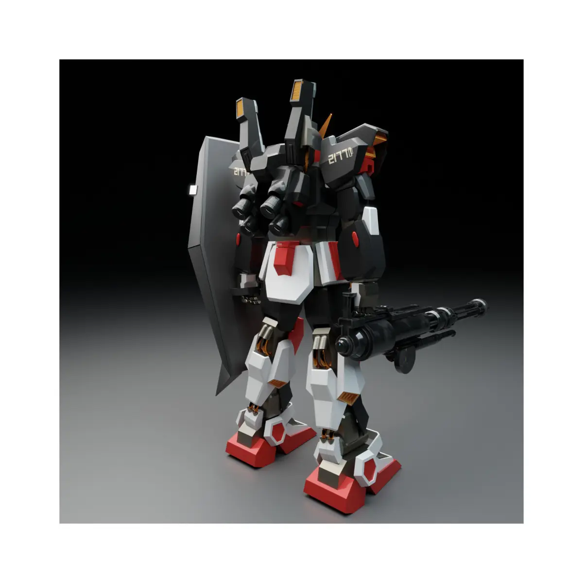 Pose: Ready for battle, gun aimed forward, shield at the ready.Background: Plain gray to highlight the robot.