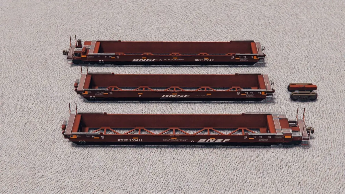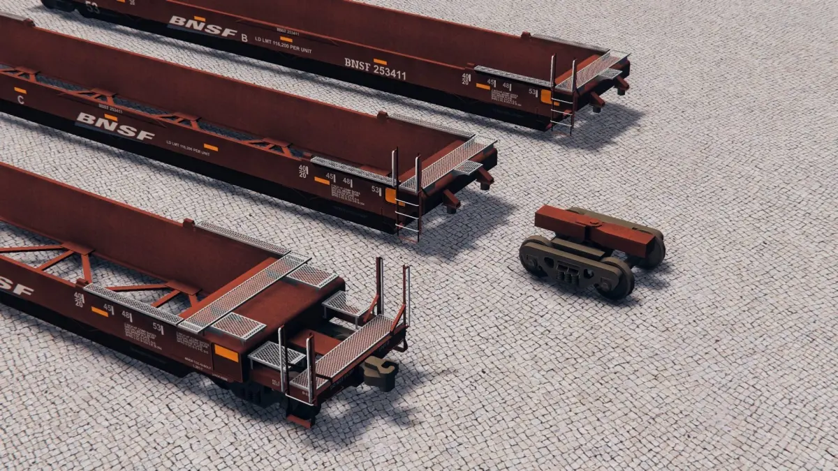 The Gunderson MAXI-IV is a 3-unit articulated double-stack well car that can transport containers from 20-foot to 53-foot long in the well and containers 40-foot to 53-foot in the top, or double-stacked, position. The Maxi-IV car is the mainstay of the U.S. domestic double-stack car fleet.