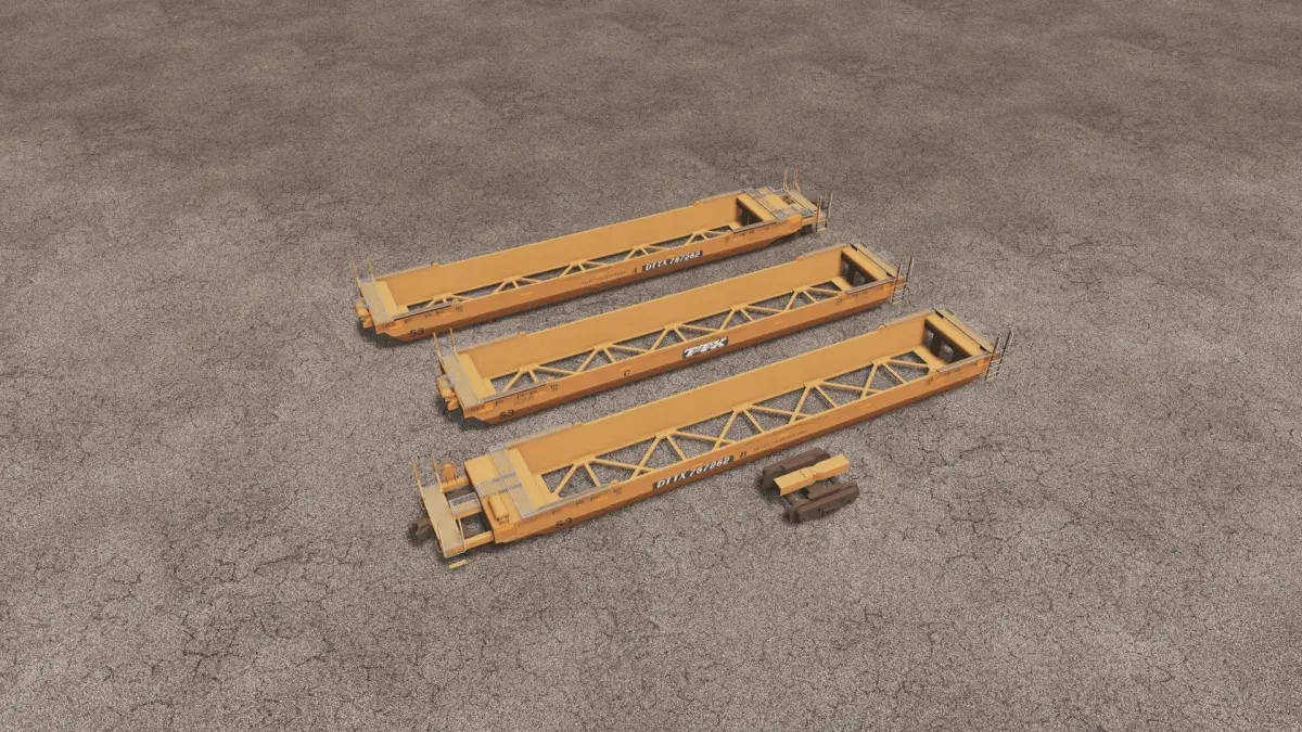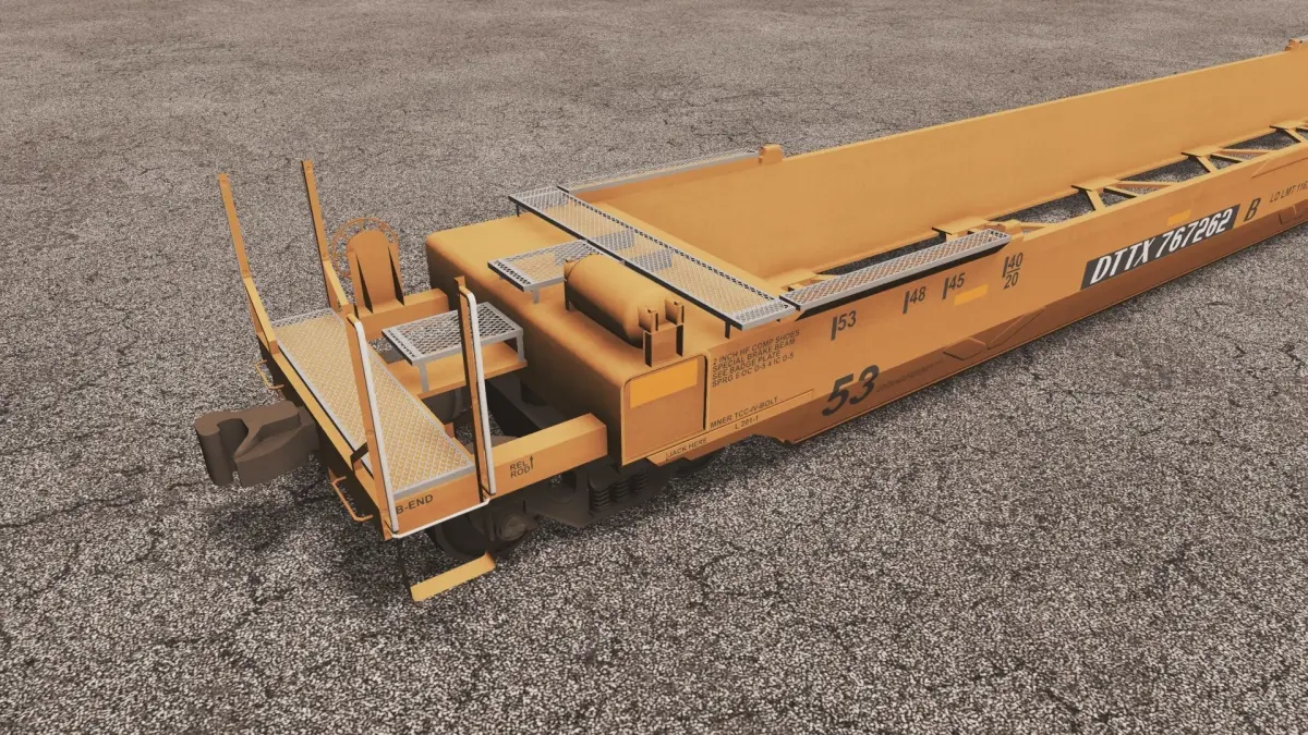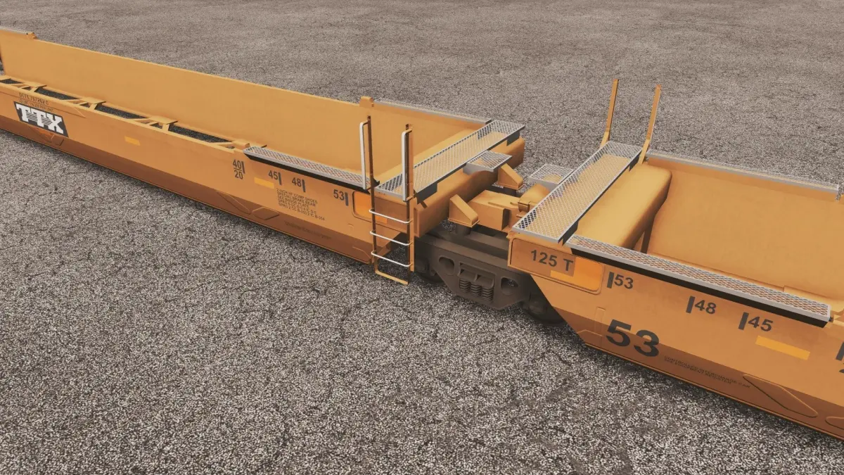 The Gunderson MAXI-IV is a 3-unit articulated double-stack well car that can transport containers from 20-foot to 53-foot long in the well and containers 40-foot to 53-foot in the top, or double-stacked, position. The Maxi-IV car is the mainstay of the U.S. domestic double-stack car fleet.