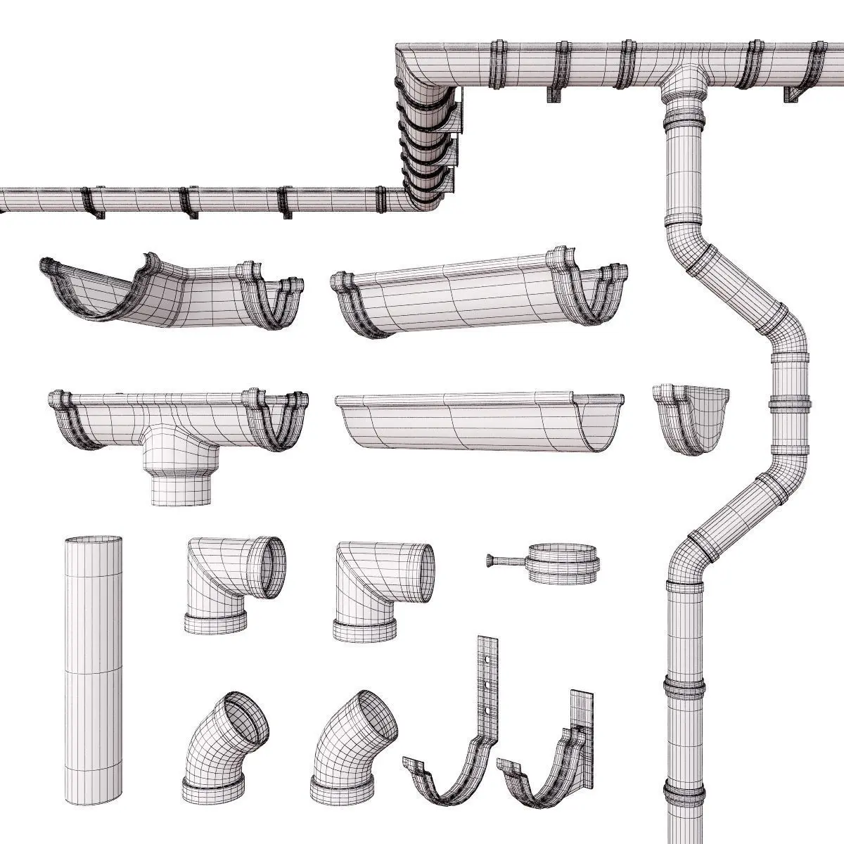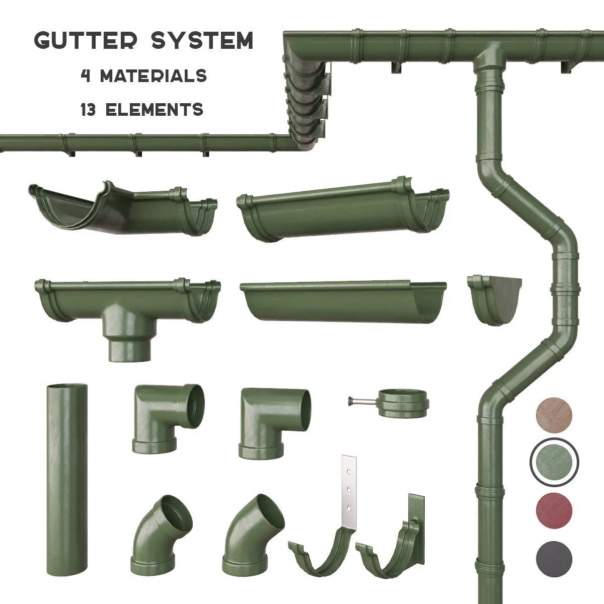 Round gutter systemThe cross section of the gutter is 120 mm.The diameter of the pipe is 80 mm.The set consists of 13 elements and 4 materials