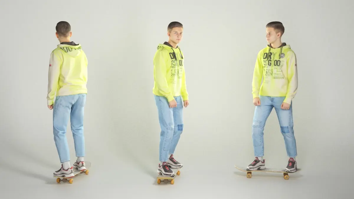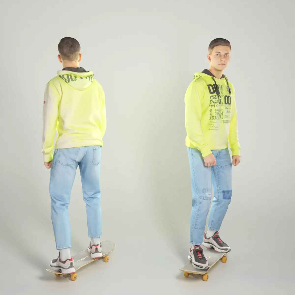 This is a true human size and detailed model of a sporty handsome young man of Caucasian appearance. The model is captured in casual pose to be perfectly matching various architectural and product visualizations, as a background or mid-sized character on a sports ground, gym, beach, park, VR/AR content etc.