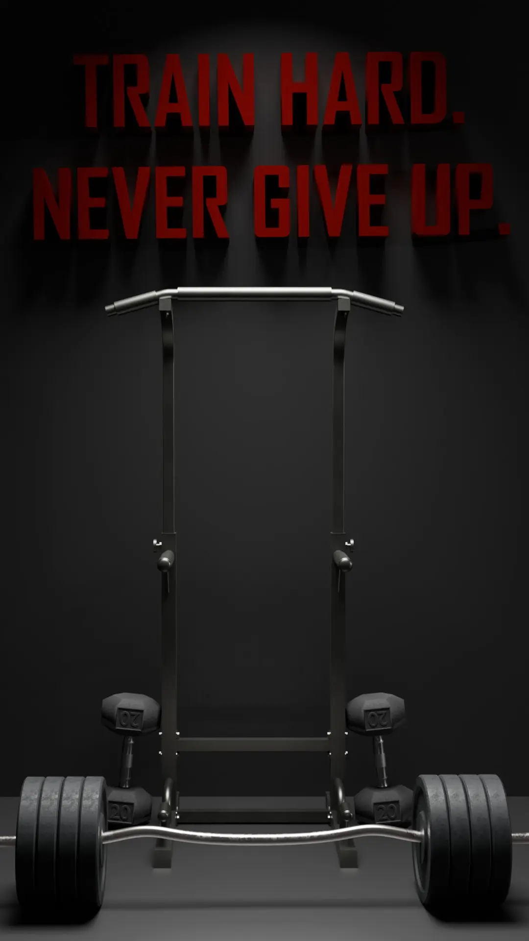 This 3D model depicts a gym setup focused on strength training equipment. At the center is a power rack with a pull-up bar, accompanied by a barbell loaded with large plates and dumbbells placed on either side. The background features a motivational quote in bold red text: Train Hard. Never Give Up, adding to the gym's intense and motivating atmosphere. The second scene includes additional equipment, such as squat racks, a bench press station, and more barbells, making this model ideal for visualizing gym or fitness environments.