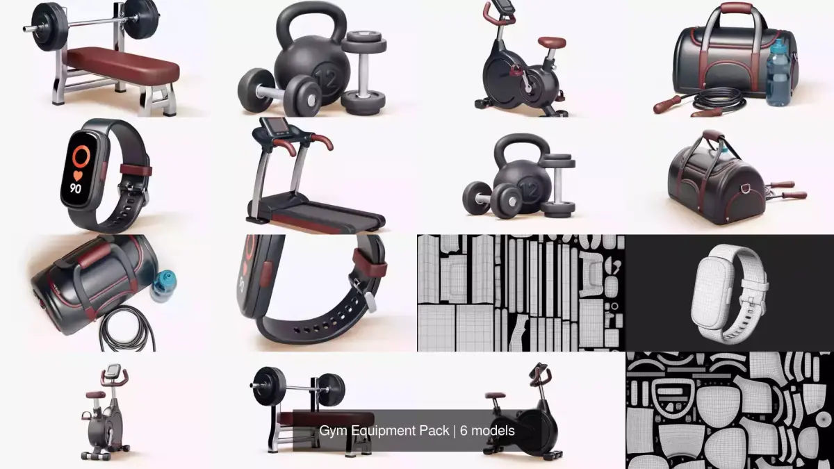 This stylized fitness set includes core gym essentials: an exercise bike, a treadmill, a bench press station with barbell, a kettlebell and dumbbells, a duffel gym bag with jump rope and water bottle, and a fitness tracker. All objects share the same dark body color with burgundy accents, rounded edges, and soft highlights, so the collection looks cohesive in one scene or split into separate props. Proportions are clean and readable, making each item instantly recognizable.