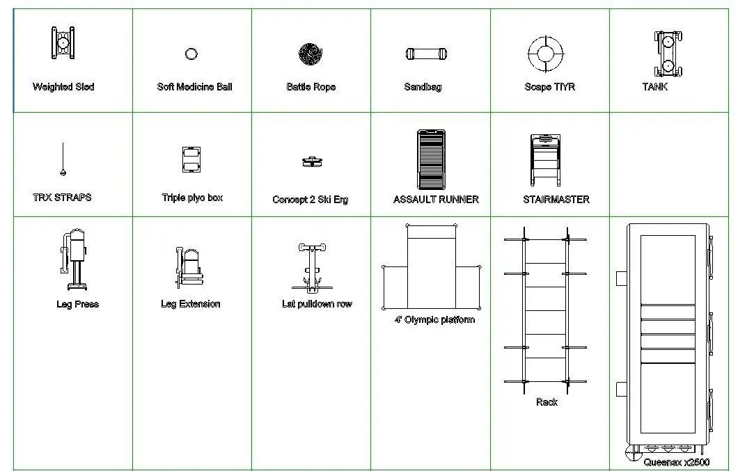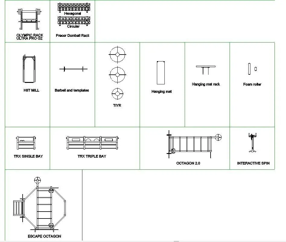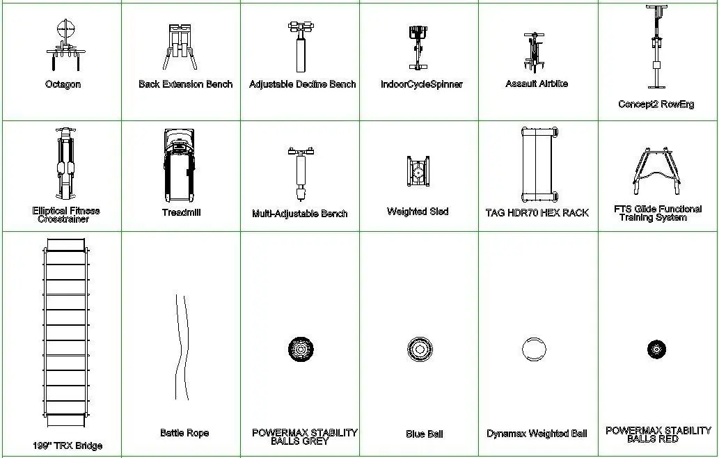 48 GYM REVIT FAMILIES4' Olympic platform: 4' Olympic platform14 X 4 Monkey Bar Rack - X1 Package: 14 X 4 Monkey Bar Rack - X1 PackageASSAULTRUNNER: ASSAULT RUNNERBack Extension Bench: Back Extension BenchBattle Rope: Battle RopeDBR0113 Adjustable Decline Bench: DBR0113 Adjustable Decline BenchEscape TIYR: Escape TIYRLat pulldown row: Lat pulldown rowLeg Extension: Leg ExtensionLeg Press: Leg PressOCTAGON T1: OCTAGON T1Weighted sled: Weighted SledSoft Medicine Ball: Soft Medicine BallSTARIRMASTER: STARIRMASTERTANK: TANKTriple plyo box: Triple plyo boxTRX: TRXQueenax 2500: Queenax 2500Sandbag: SandbagConcept 2 Ski Erg: Concept 2 Ski ErgIndoorCycleSpinner: IndoorCycleSpinnerAssault Airbike: Assault AirbikeConcept2 RowErg: Concept2 RowEElliptical Fitness Crosstrainer: Elliptical Fitness CrosstrainerTRM 781 Treadmill: TRM 781 TreadmillDiscovery Series Multi-Adjustable Bench: Discovery Series Multi-Adjustable BenchWeighted SledV2: Weighted SledV2TAG HDR70 HEX RACK: TAG HDR70 HEX RACKBOSU Home Balance Trainer: Blue BallDynamax Weighted Ball: Dynamax Weighted BalPOWERMAX STABILITY BALLS RED: POWERMAX STABILITY BALLS REDPOWERMAX STABILITY BALLS GREY: POWERMAX STABILITY BALLS GREYBattle Rope1: Battle RopeTRX Single Bridge: 199"TRX BridgeTRX_Bridge_Post: TRX_Bridge_PostTRX Shelf: TRX ShelfFTS Glide Functional Training System: FTS Glide Functional Training SystemOLYMPIC RACK ULTRA PRO G2: OLYMPIC RACK ULTRA PRO G2Precor Dumbell Rack V1: CircularPrecor Dumbell Rack V1: HexagonalHIIT Mill: HIIT MillBarbell and templates: Barbell and templates90 TIYR: 90 TIYR175 lbs TIYR: 175 lbs TIYR220 lbs TIYR: 220 lbs TIYRHanging mat: Hanging matHanging mat rack: Hanging mat rack36 Foam roller: 36x636 Foam roller: 12x6TRX SINGLE BAY: TRX SINGLE BAYTRX TRIPLE BAY: TRX TRIPLE BAYEscape octagon: Escape octagonOctagon 2.0: Octagon 2.0Interactive spin: Interactive spin