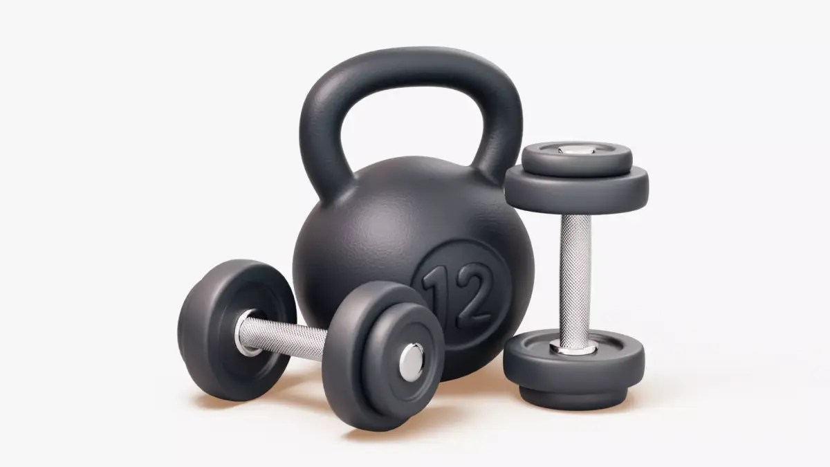 Stylized fitness set consisting of a round black kettlebell with embossed “12” mark and two compact dumbbell forms with metal knurled grips. The shapes are clean and slightly rounded, with soft highlights on the dark rubber parts and subtle texture on the kettlebell body, so every object stays readable even at smaller sizes. Neutral dark color keeps the set universal and easy to combine with benches, racks, or other gym props.