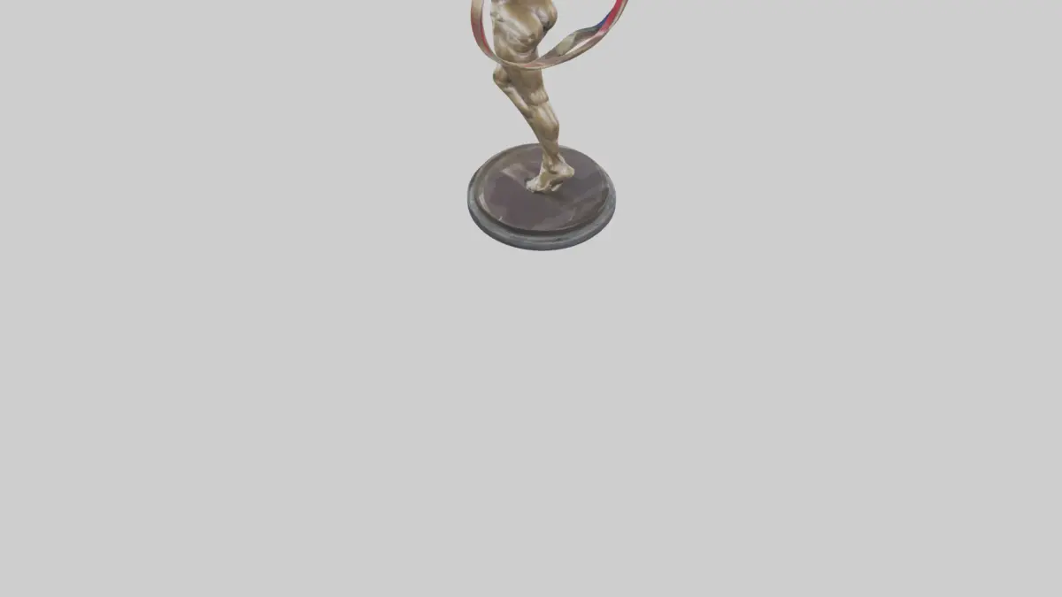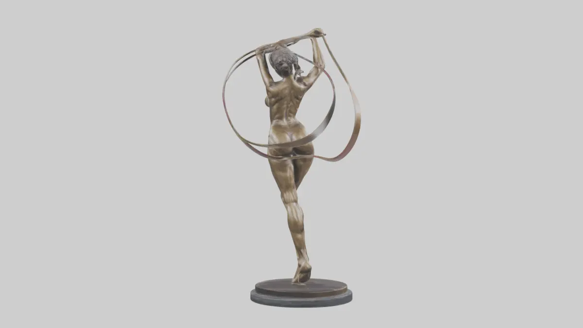 Concise 3D model of a Gymnast with Ribbon statue. Depicts a 3D representation of a statue or sculpture of a gymnast engaged in rhythmic gymnastics, specifically performing with a ribbon. The model should capture the dynamic and graceful movements associated with this discipline. The gymnast could be shown in various poses, such as leaping, twirling, balancing, or performing intricate ribbon patterns like spirals, throws, and catches. The ribbon itself should be flowing and visually interesting, suggesting motion and fluidity. The gymnast's body should be sculpted to reflect the athleticism and flexibility required for rhythmic gymnastics. The style could range from realistic, accurately portraying human anatomy and movement, to more stylized or artistic interpretations that emphasize the beauty and fluidity of the performance. Materials imagined for the statue could include bronze, marble, ceramic, or even a translucent material to suggest the lightness and grace of the gymnast and the ribbon. Suitable for sports-related visualizations, art collections, educational materials about gymnastics, games or animations featuring sports, and decorative purposes celebrating athleticism and artistry. Available in FBX, OBJ, STL, GLB, USDZ, and BLEND formats.