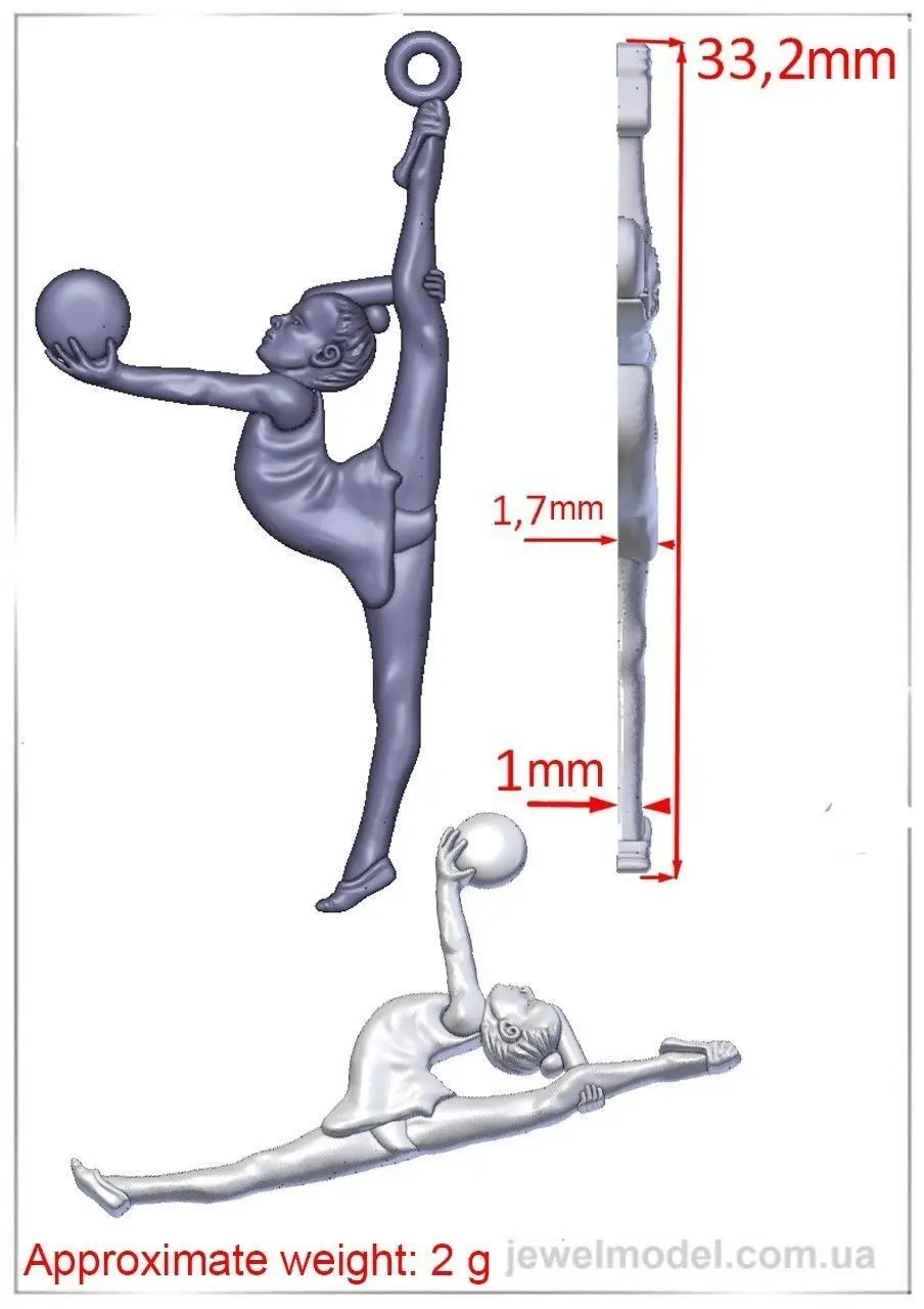 Gymnastic girl lightweight pendant for jewelry manufacturingready to print or waxmillapprox. weight in 14k gold 2 gapprox. weight in 925 silver 1.6g