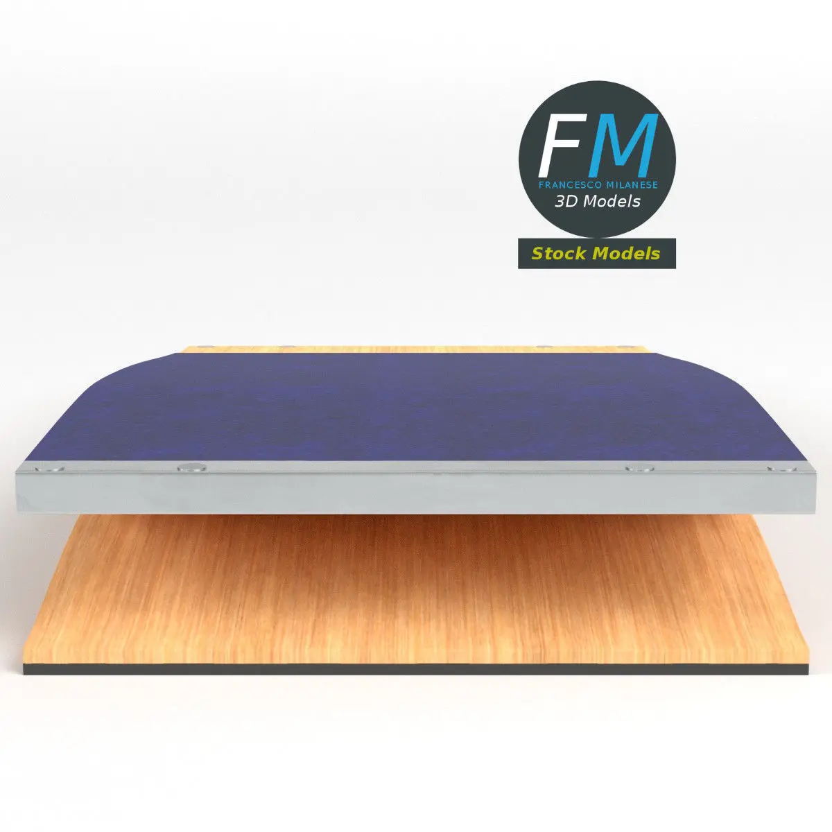 Gymnastics springboard 3D Model, nr. 1 in my collection. Production-ready 3D Model, with PBR materials, textures, non overlapping UV Layout map provided in the package.Quads only geometries (no tris/ngons).Easily customizable: UV unwrapped geometries, so you can create new Textures (or modify the existing ones) using the UV Layout maps provided in the package (as png with alpha).Each Object, Material or Texture provided in the package has a unique, meaningful name.Made in Blender 3.1 with a Cycles PBR shader with textures included (principled and Eevee compatible), then exported to OBJ and FBX; materials and textures made in Substance Painter, exported for PBR, V-Ray, Unity, Unreal.PROMO IMAGES: the first image has been rendered in Cycles for Blender; in particular, you can find 11+ promo images in this description: