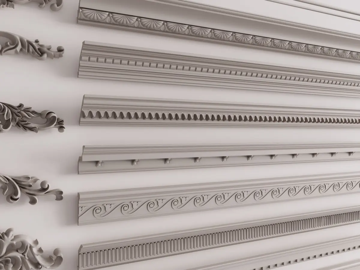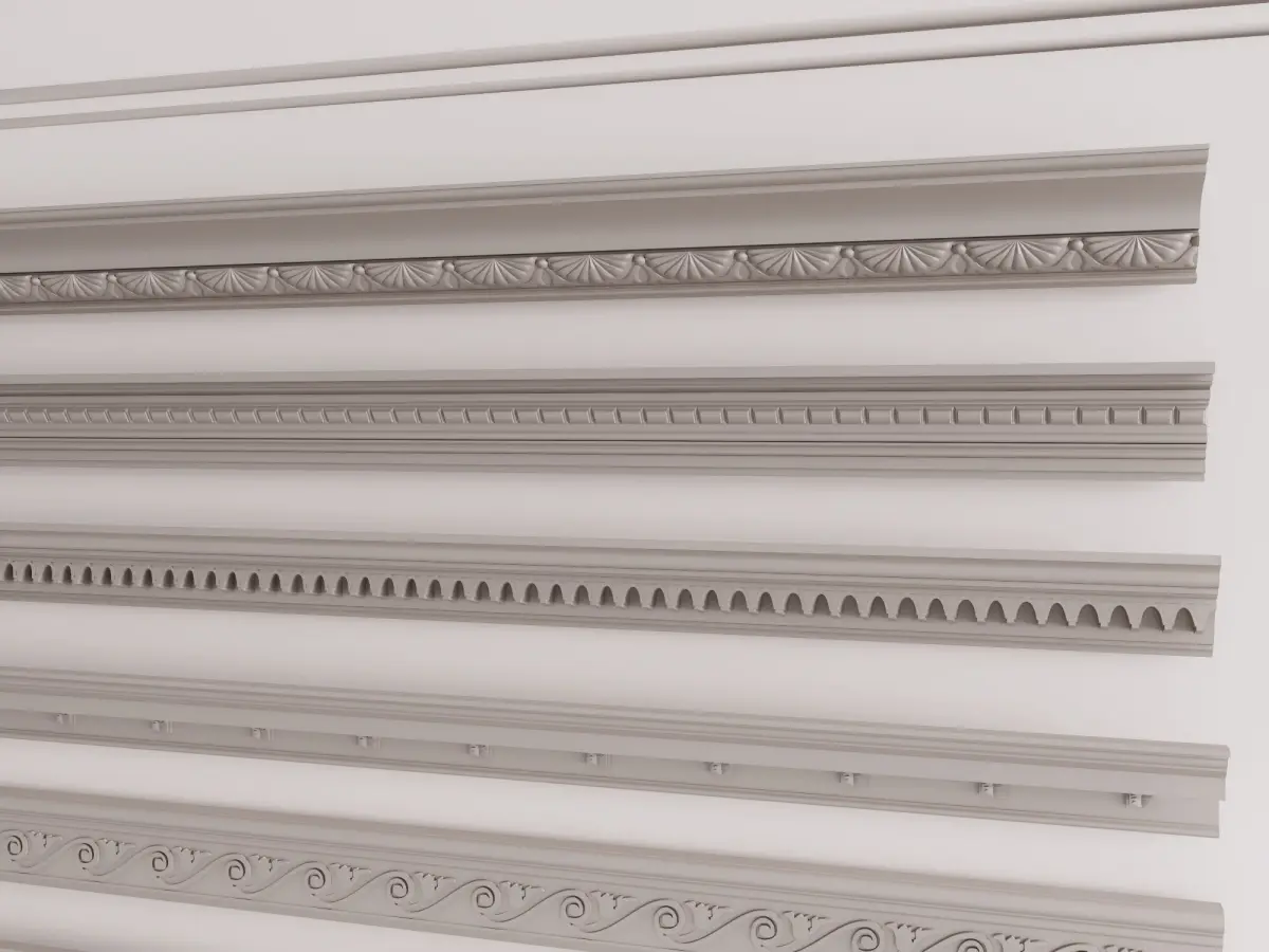 Pattern System· Baroque: Acanthus volutes|Rosette relief|Cable twists· Geometric: Greek key|Diamond facets|Step profilesSpatial ApplicationHigh ceiling cornices|Foyer accent walls|Wainscoting caps|Fireplace framingIt was created with SketchUp and rendered with Enscape, including lighting and materials. Feel free to check it out, and if you have any questions, please contact me. Thank you.