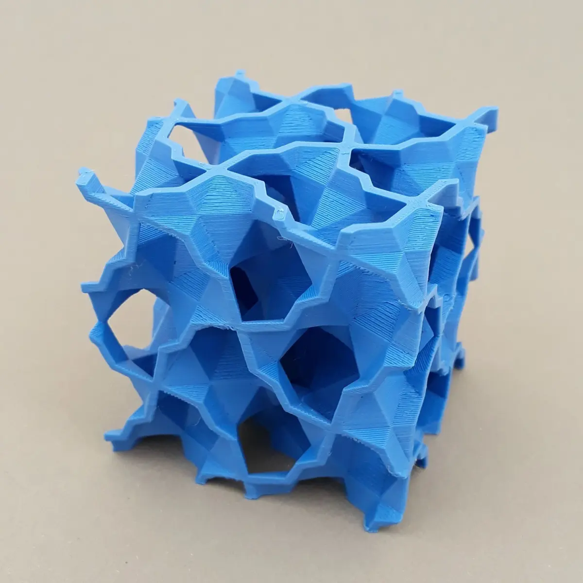 This is thickened lowpoly GYROID surface.The gyroid is an infinitely connected triply periodic minimal surface discovered by Alan Schoen in 1970.The gyroid separates space into two oppositely congruent labyrinths of passages. Channels run through the gyroid labyrinths in the (100) and (111) directions.