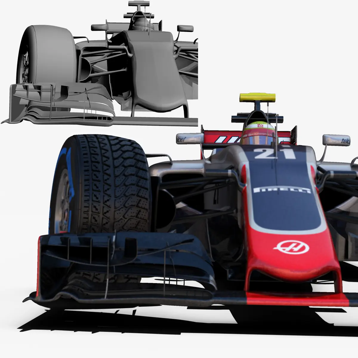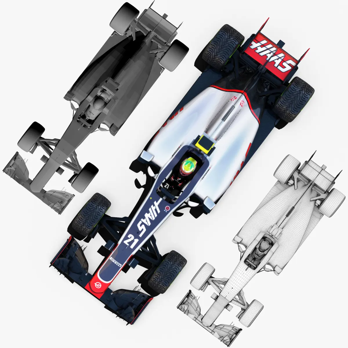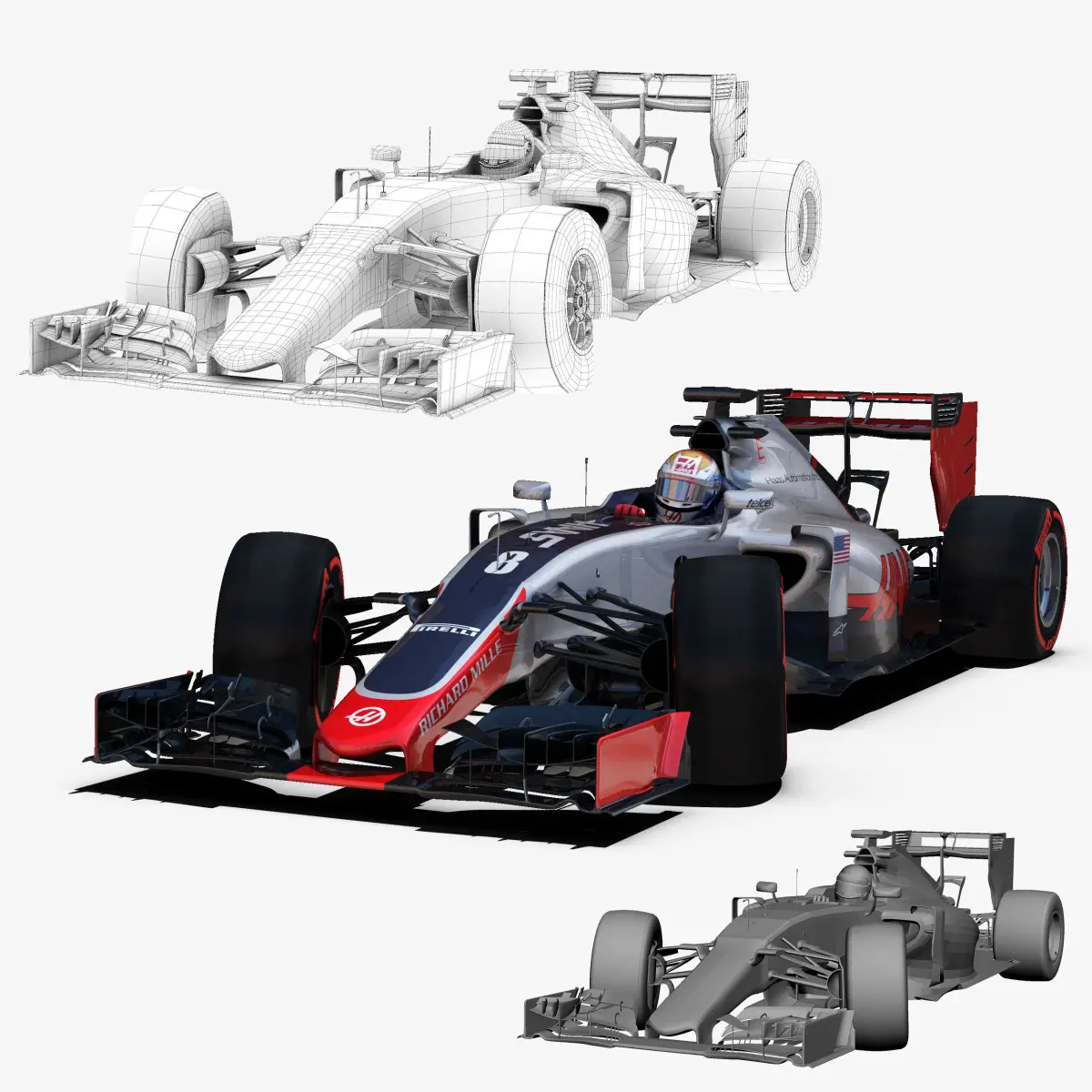 This is a 3D low poly model ,it was designed to provide a high definition in a low poly. Standard low-poly mesh with specific poly count. It`s the most accurate and realistic Haas VF16 of the market. It has all of details of Haas VF16 model. Rigged in the maya version. This is a recreation of Haas VF16 model,it can suffer modification over the season. Included all types os wheels, Romain Grosjean and Esteban Gutierrez, theirs helmets and the steering wheel. The model is completely ready for use visualization in maya. For low poly model simply press 1 and for the high resolution press 3. In Cinema4d go to function menu and subdivide. In 3dmax meshsmooth In the low poly: Poly count : 81647 Vertex count : 84815 In the high poly: Poly count : 1335888 Vertex count : 1348651Textures included. Each texture is in jpg format and have a 4K texture resolution for high quality It has three UV textures, one for the car , other for the tires and the last one for the driver. It has color textures, specular textures, displacement textures,bump textures. The files are obj, fbx, mb ,c4d and 3DS. Included 7 different poses of each driver. In formats c4d, 3ds, obj and fbx model exported to standard materials (textures), not contain mental ray shaders. files with the model does not contain extraneous or hidden objects (lights, cameras, etc.). Included rigging and constrains, blend shapes and driven keys only in the maya format. In the maya format you can easily change the wheels, the pilot and the DRS(open and close). original file format maya render in linear sRGB