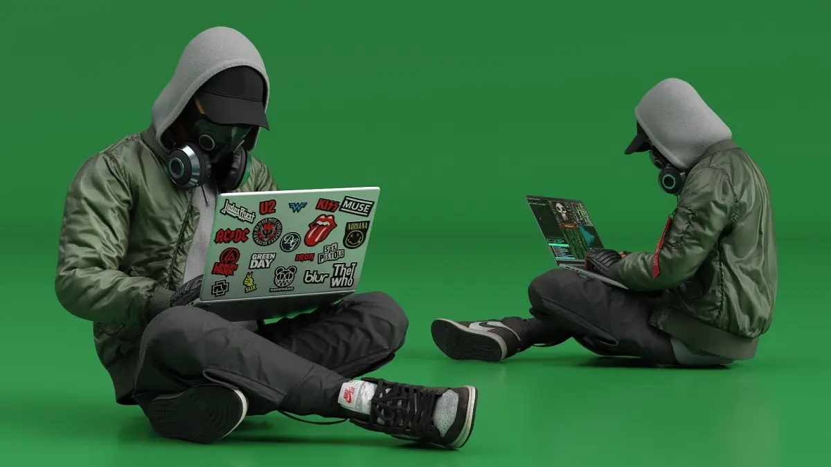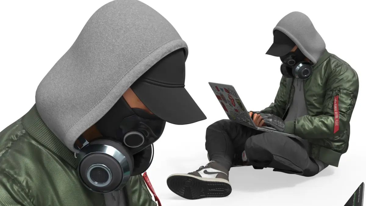 Hacker Streetwear Character Sitting Pose is a three-dimensional model of male figure featuring a discernible outfit, laptop, hoodie, and a mask.