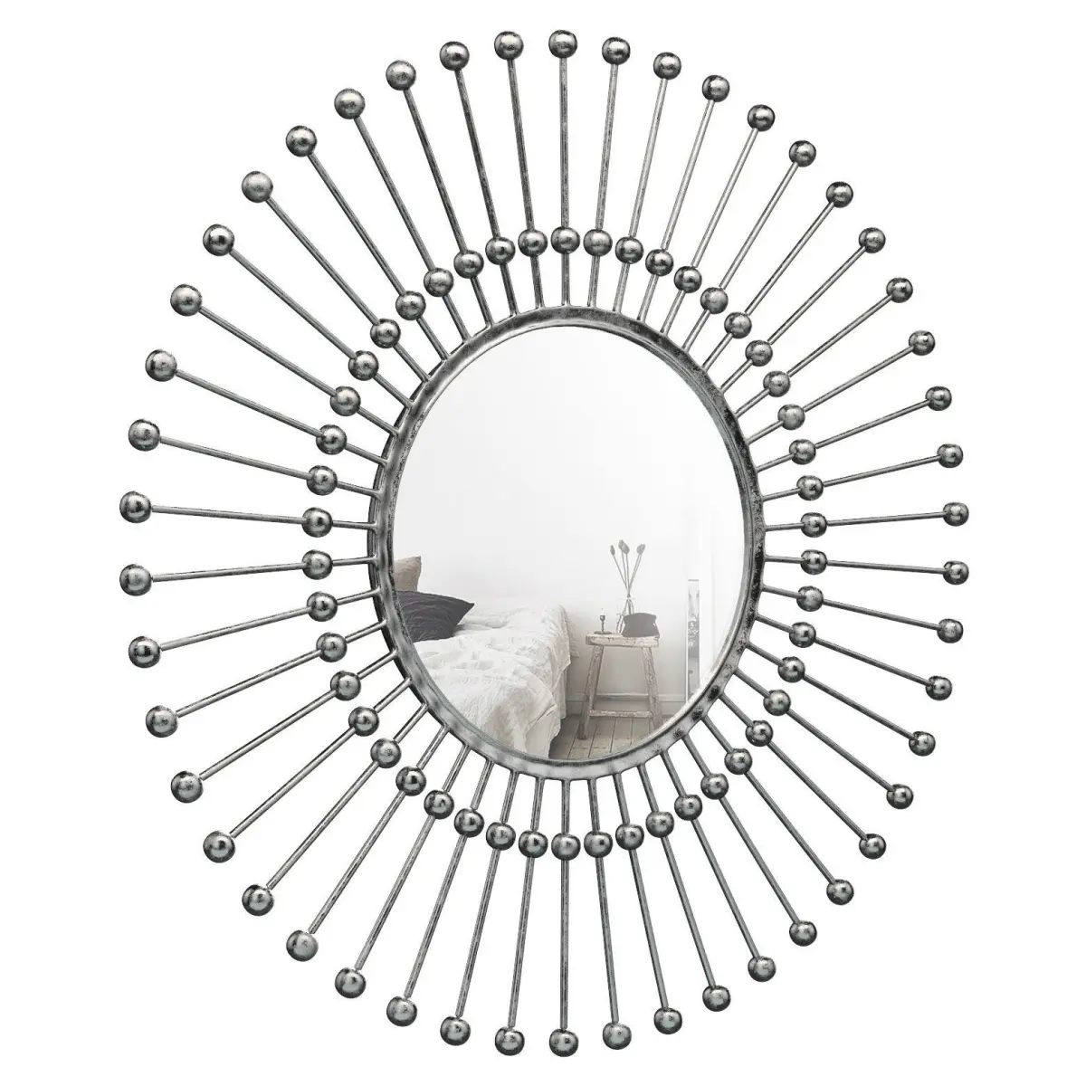 The elegant silver sunburst mirror is the perfect mid-century modern accent piece for any decor Constructed of iron, this circle mirror features a sunburst frame inspired by the vintage decor of the 1960s Hangs securely to any surface with durable hangers on the back Add a clean modern element to your home with this classic sunburst mirror in an elegant gold finish
