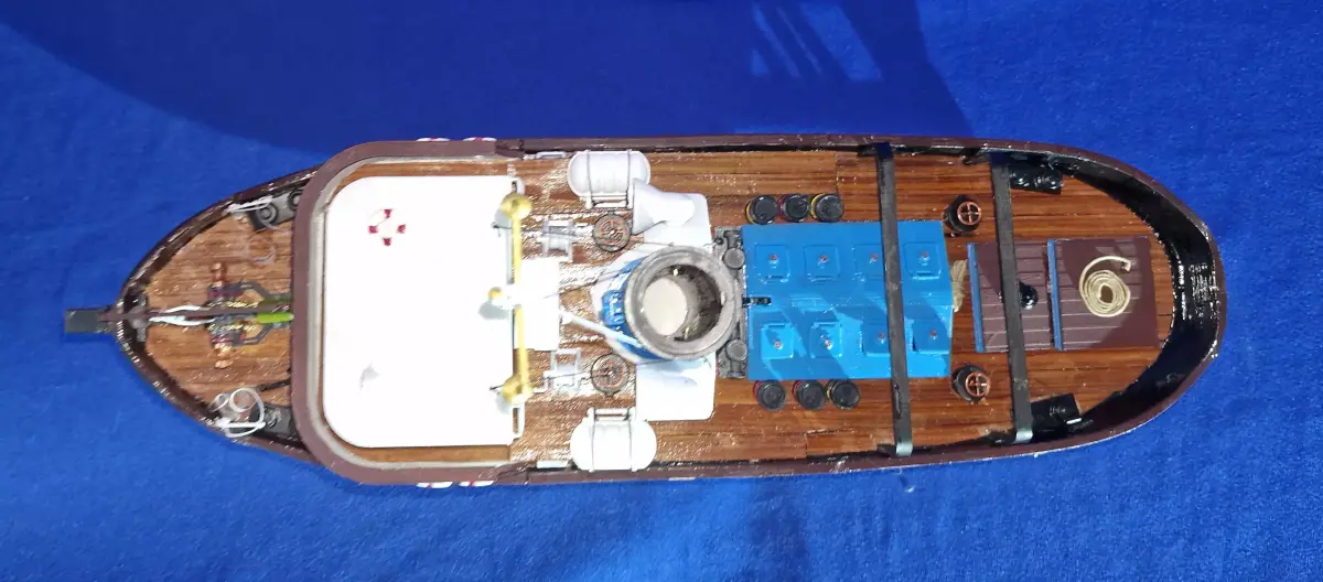 Das Schiff ist in Anlehnung an den Modell-Schlepper Anteo entworfen basierend auf einem typischen südeuropäischen Hafenschlepper. Seine Modell-Abmessungen sind ca. 47 cm Länge, 14,5 cm Breite und 30 cm Höhe im Maßstab 1:50. Das Modell stellt einen klassischen Schlepper dar, wie er bis in die 1970er Jahre zu finden war.Ich habe mein Modell auf den Namen TRONSHAGEN getauft.Theoretisch kann das Modell auch mit einem Antrieb ausgebaut werden.