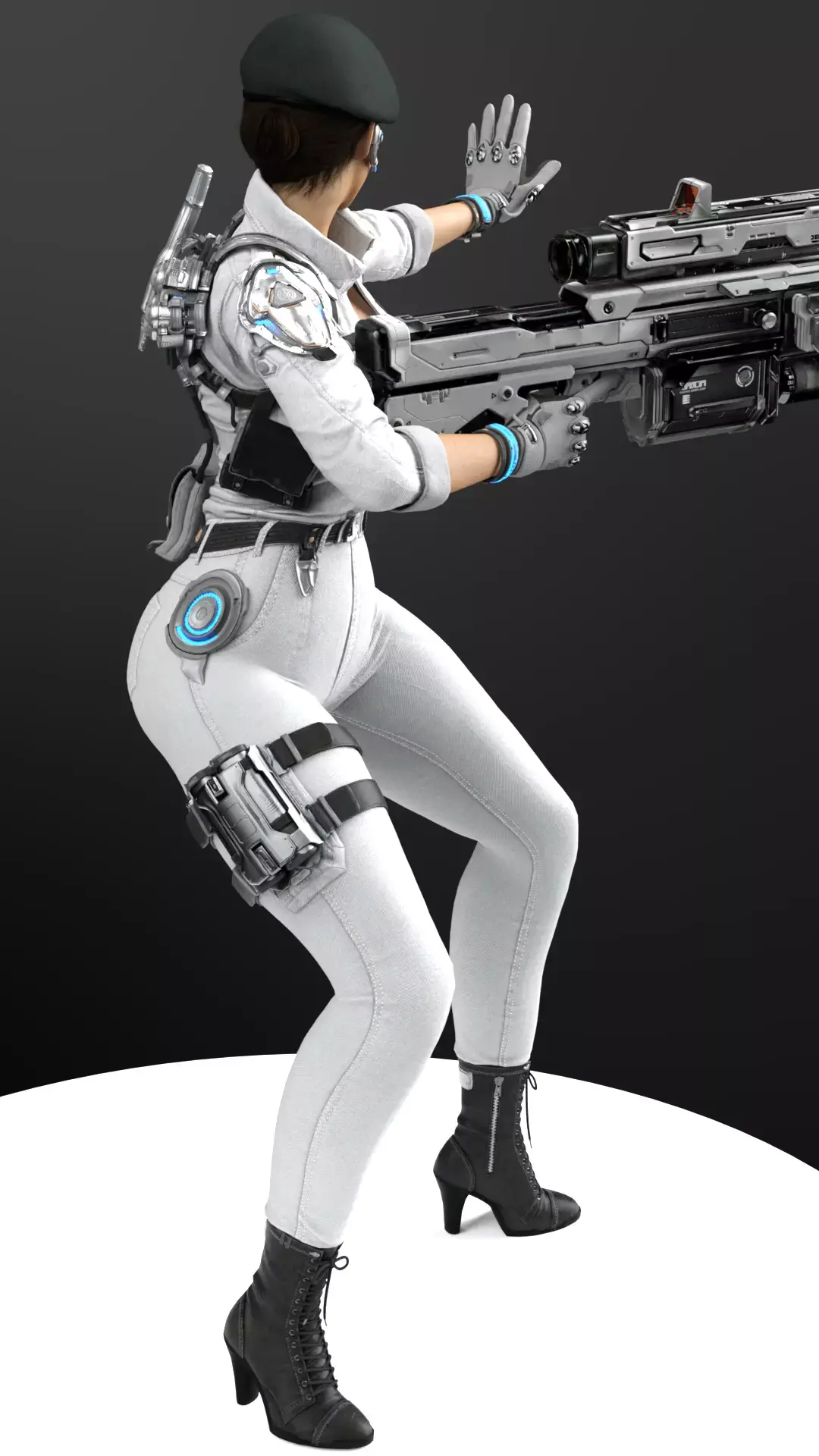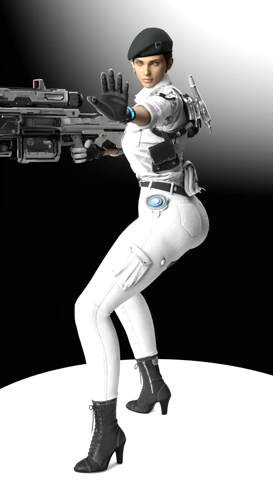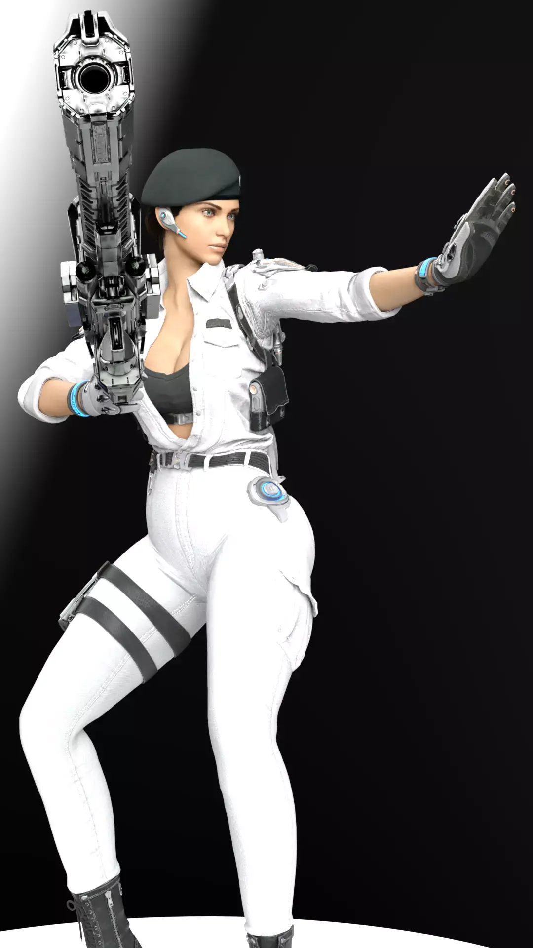 Model Optimization / File Formats (Hypothesis)FBX (FilmBox): Ideal format for animation and use in game engines.OBJ (Object File): Universal format for static geometric mesh.STL (Stereolithography): Single-piece version for 3D printing.STL Separated Parts: Pre-separated version to facilitate printing and painting (weapon, main body, head/beret, cybernetic parts).Important Note for 3D Printing:Fine Details: Resin printing (SLA/DLP) is crucial to capture the details of the beret, the ear communication accessory, and the complexity of the heavy cannon.Stability: The figure is moderately stable. The weight of the weapon will require a strong contact point at the hands and possibly temporary support.Supports: Significant supports will be required for the weapon, the extended arm, and the protruding cybernetic pieces.Painting: Matte or satin white paint will be needed for the uniform and bright metallics for the weapon and cybernetic parts. The blue light effect on the hip can be achieved with fluorescent paint or an LED if the model is hollowed out.