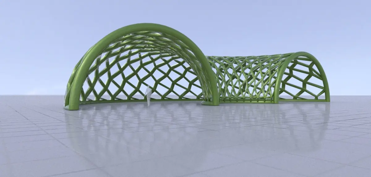This is a Half circle structure with open ends made using Rhino 3D and Grasshopper plugin. Rhinoceros is primarily a free form surface modeler and Grasshopper is a visual programming language and environment that combined create unique designs.