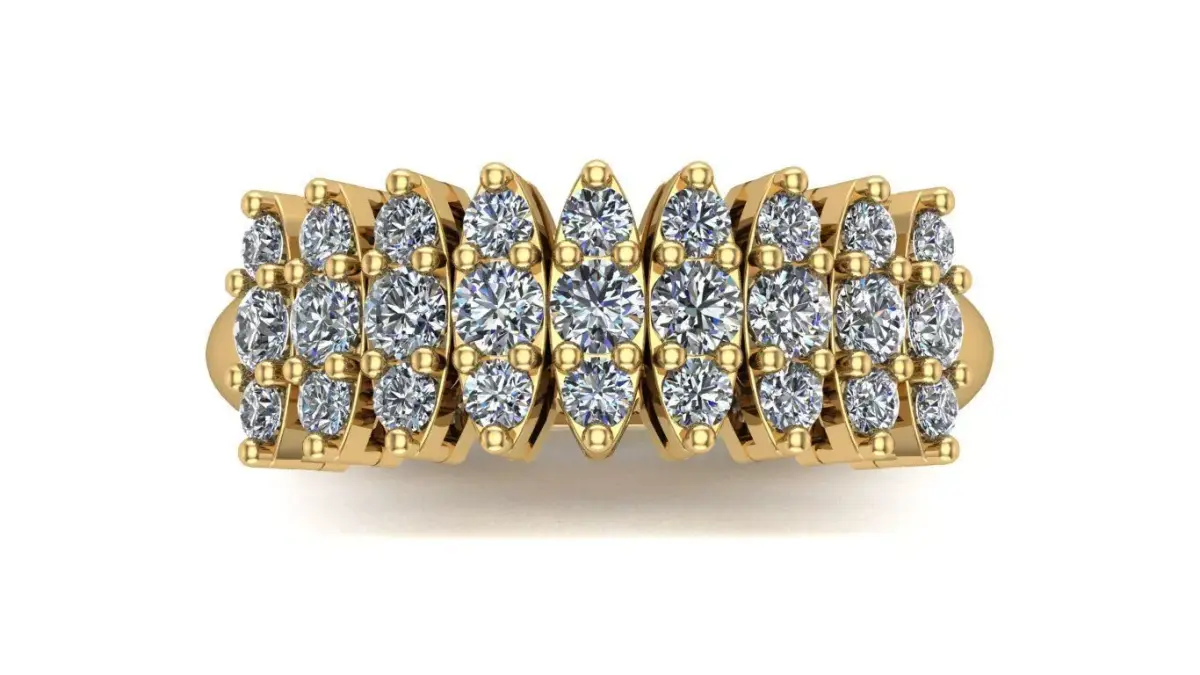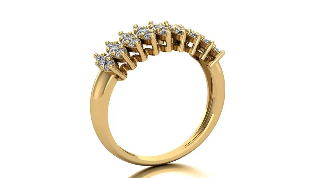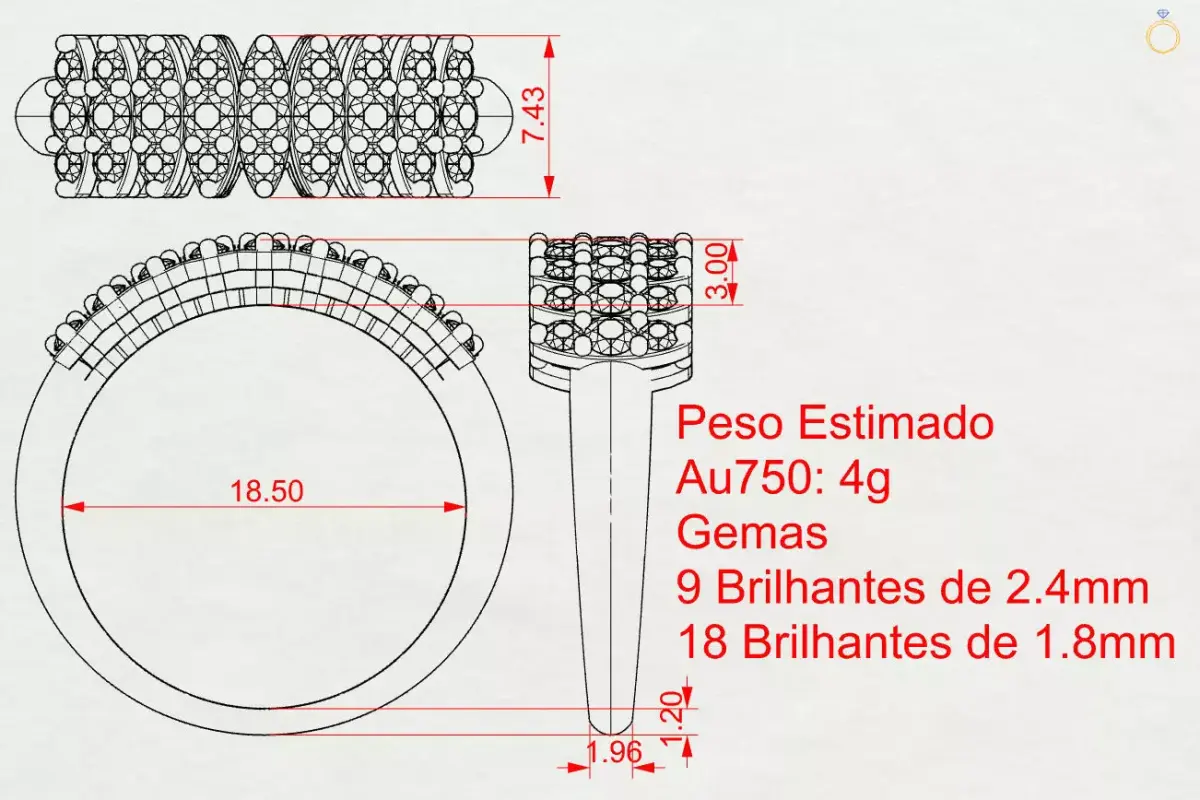 Half-Eternity Navette Diamond Ring in 18K Gold (Au750), with an estimated weight of 4 grams. The ring features 9 brilliant-cut diamonds of 2.4 mm and 18 brilliant-cut diamonds of 1.8 mm, arranged in a navette pattern that provides elegance and remarkable brilliance.The measurements of the piece are shown in the image in millimeters