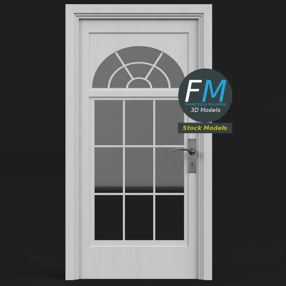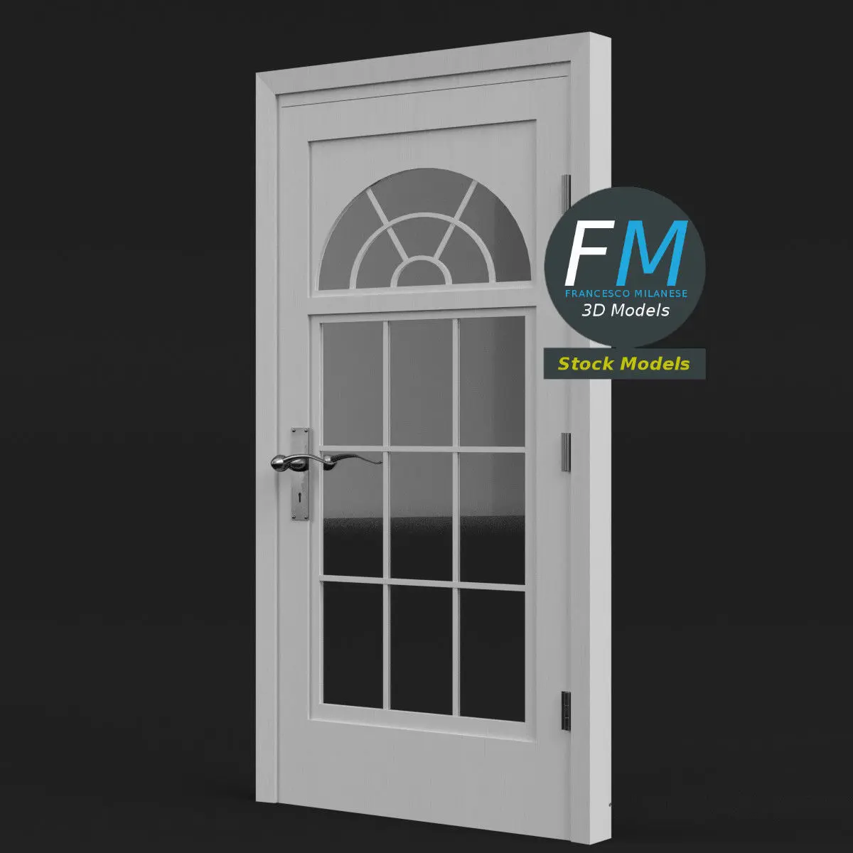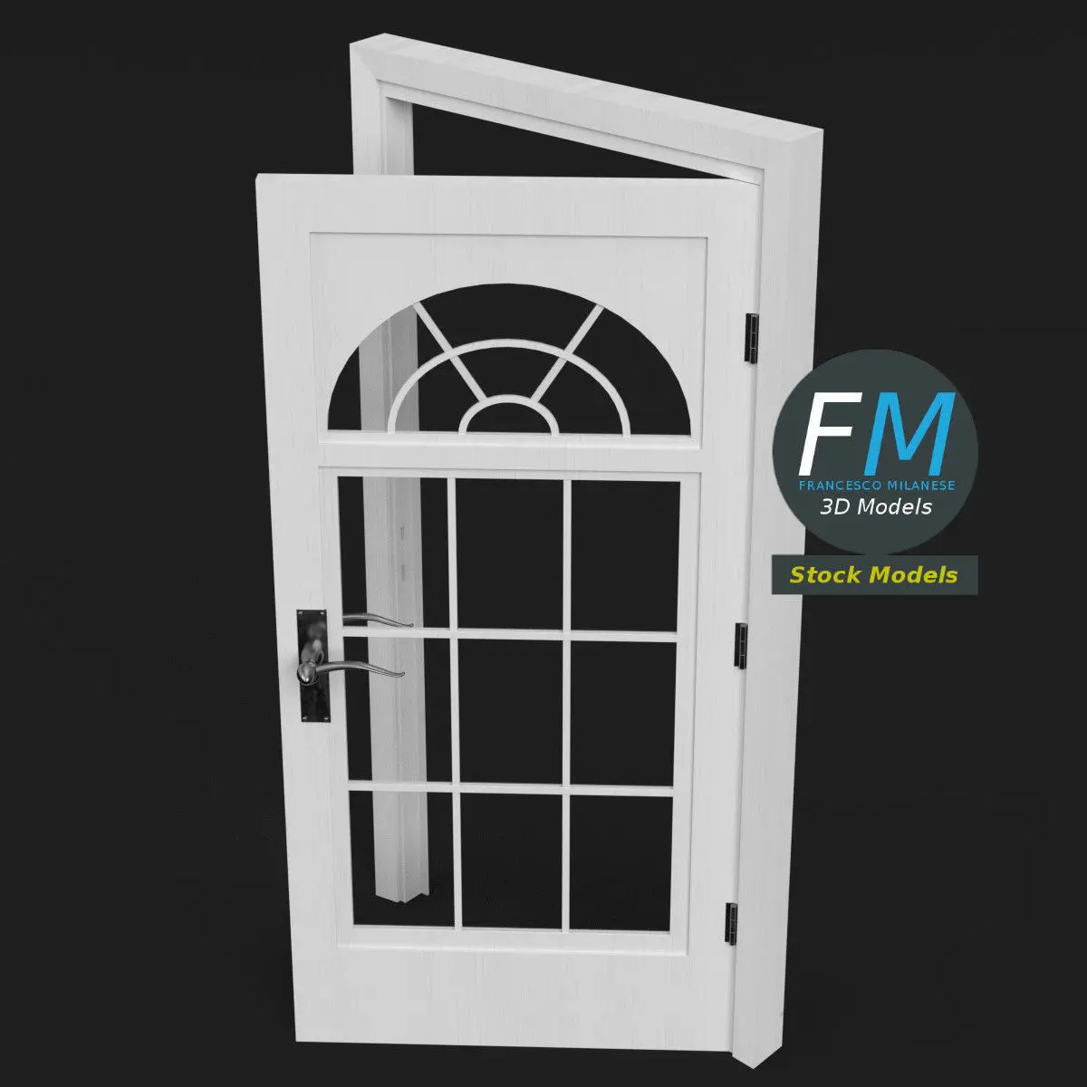 Half Moon casement window door 3D Model. 3 individual objects (frame, panel, glasses; so, you can rotate or even animate the door), sharing 2 non overlapping UV Layout maps, Materials (door_and_frame, glass) and PBR Textures sets. Production-ready 3D Model, with PBR materials, textures, non overlapping UV Layout map provided in the package.