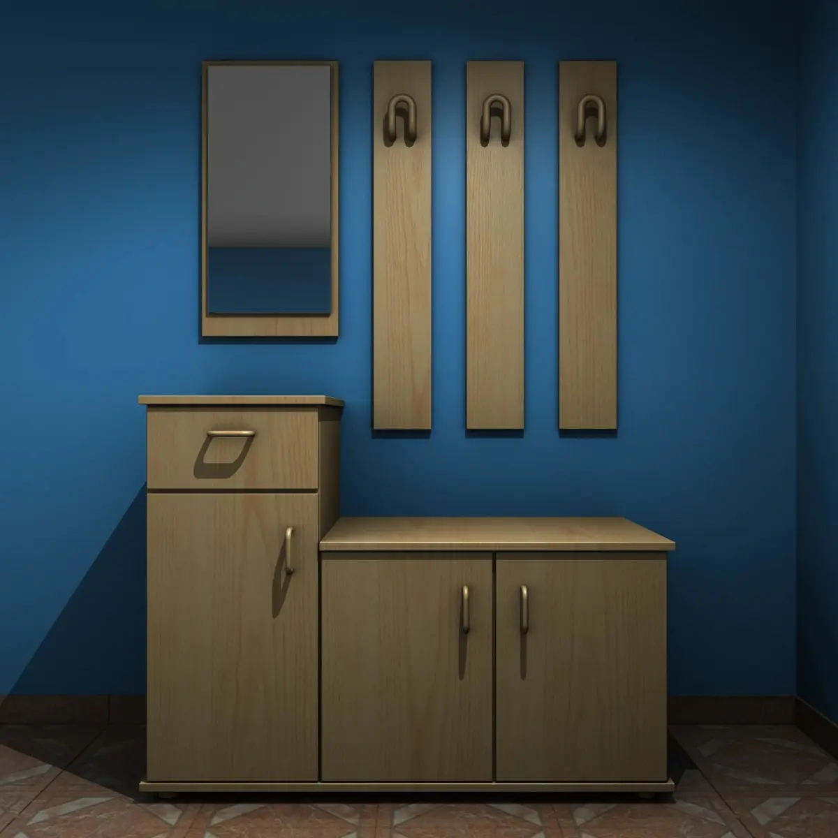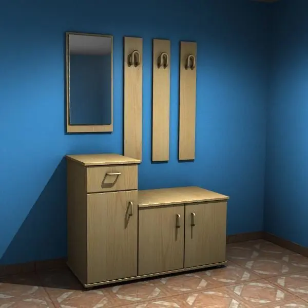 Hall furniture with mirror and hangersknows in wood, full modelledMirror material and basic wood