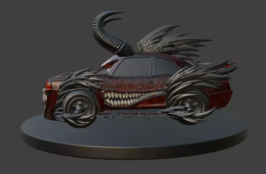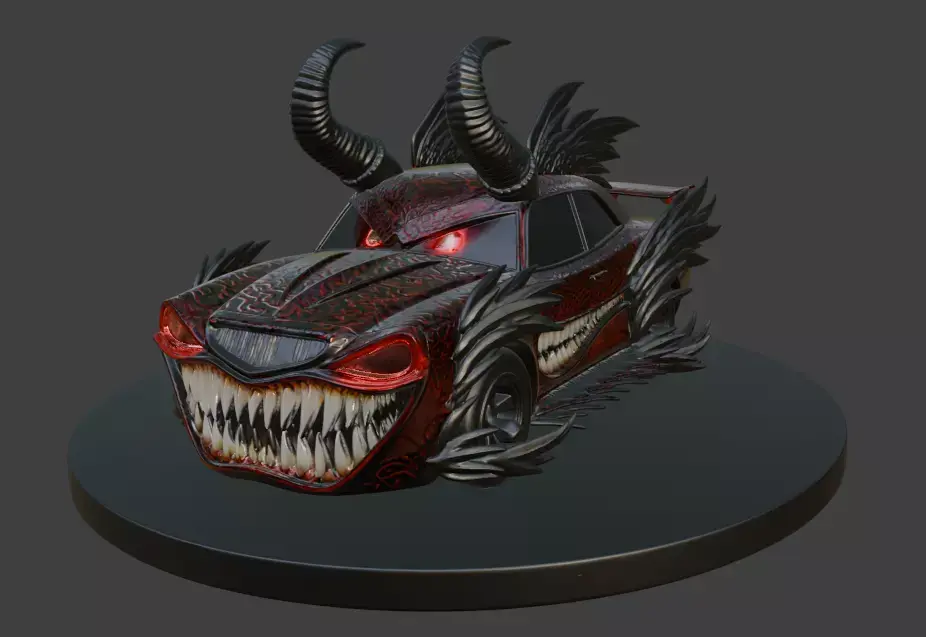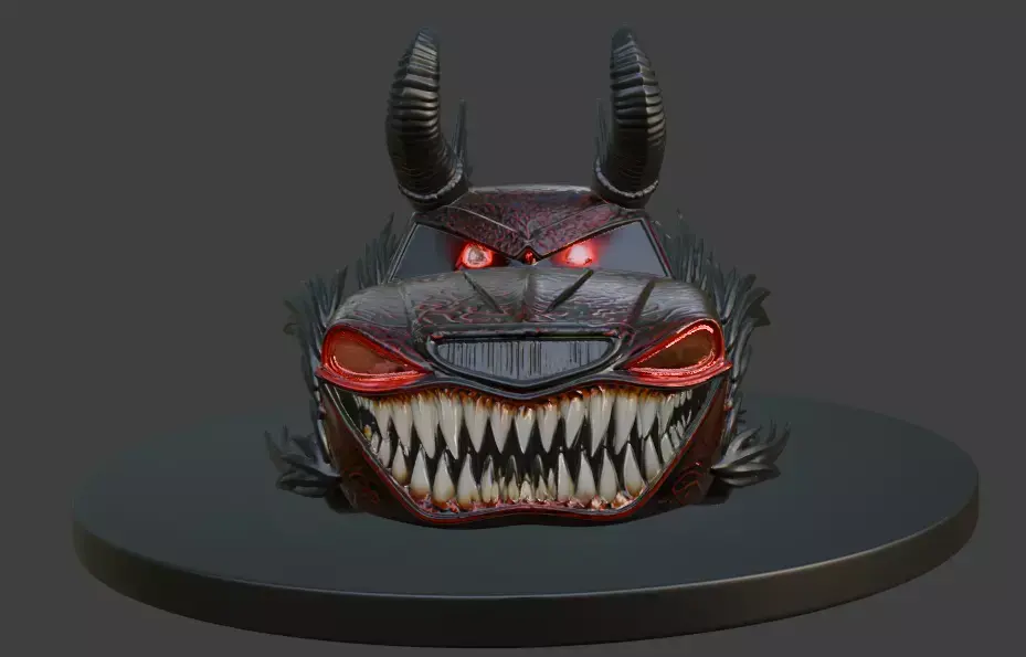 Roar into the night with the Halloween Beast Car, a fearsome 3D model that fuses a sleek car with a demonic visage, complete with twisted horns, glowing red eyes, and a gaping maw of jagged fangs. Crafted with a dark, fiery aesthetic and adorned with sharp, wing-like protrusions, this model stands menacingly on a circular base, ideal for Halloween displays, gaming assets, or eerie digital art creations.
