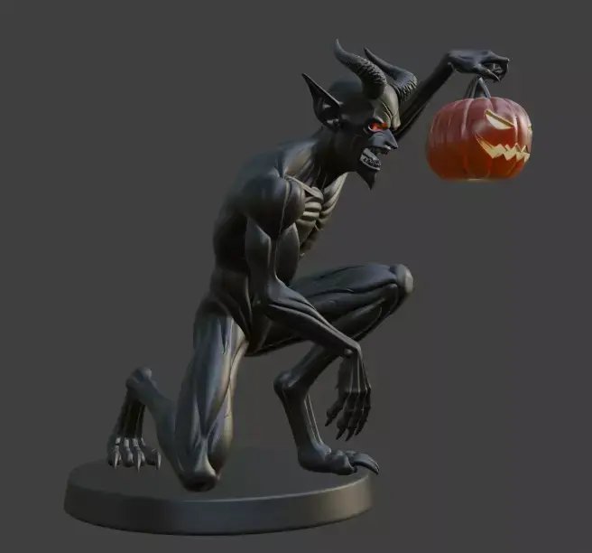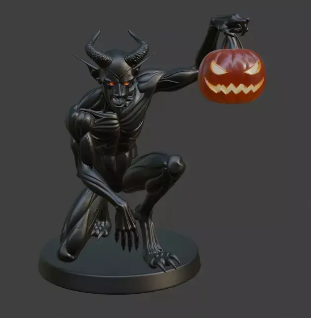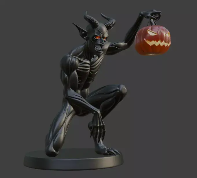 This eerie 3D model showcases a menacing black demon in a crouched pose, holding a carved pumpkin with a sinister grin. Featuring glowing red eyes, sharp claws, and prominent horns, the figure stands on a circular base, making it a striking addition to Halloween decor or a dynamic piece for gaming and fantasy settings.