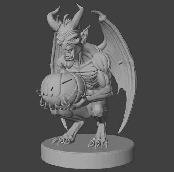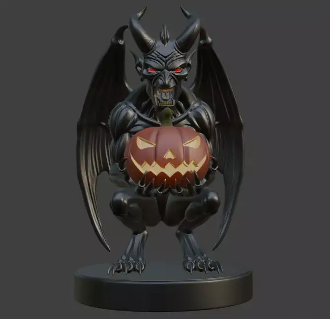This eerie 3D model showcases a menacing black demon in a crouched pose, holding a carved pumpkin with a sinister grin. Featuring glowing red eyes, sharp claws, and prominent horns, the figure stands on a circular base, making it a striking addition to Halloween decor or a dynamic piece for gaming and fantasy settings.