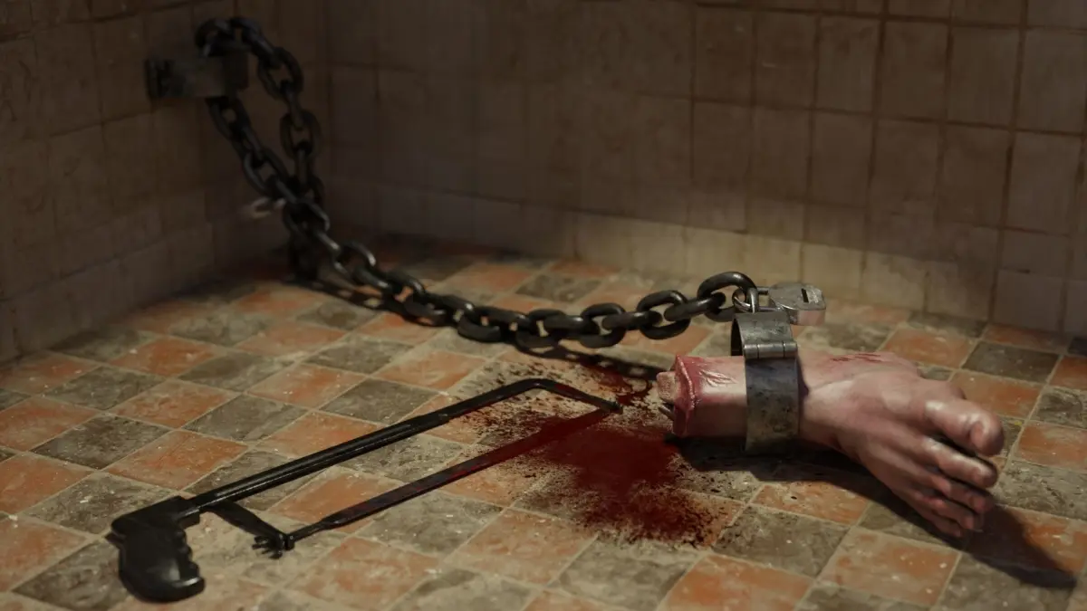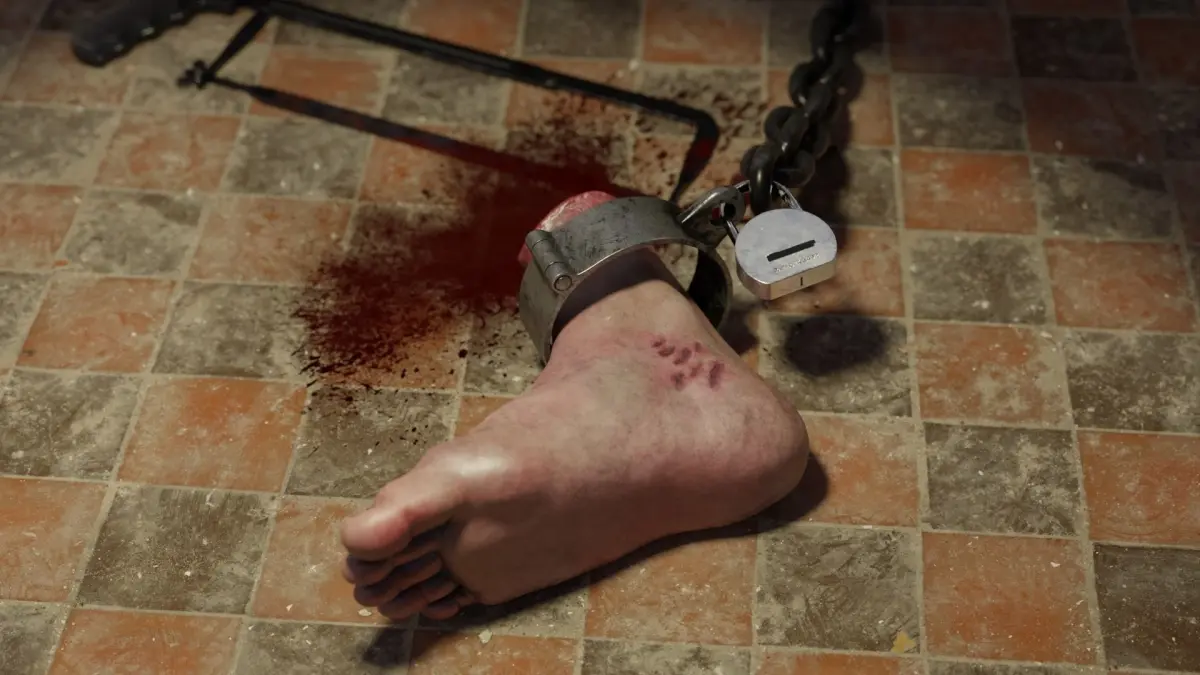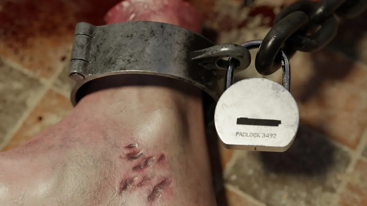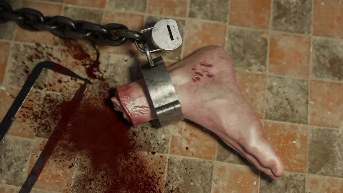 Chilling scene of sawed-off foot attached to wall with chains to use individually or together in video games, animations or high-quality renders.
