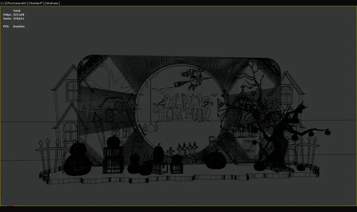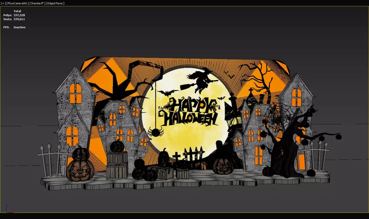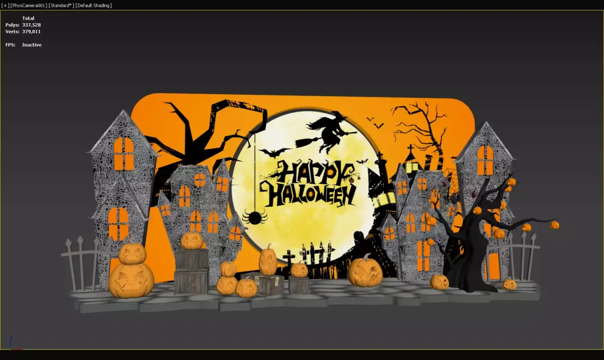 Halloween decorative scene featuring illuminated haunted houses, various pumpkin lanterns, a Happy Halloween backdrop with a witch and full moon, and spooky elements like bats and spiders. Ideal for party, event, or home decor, creating a festive and eerie atmosphere for Halloween celebrations.
