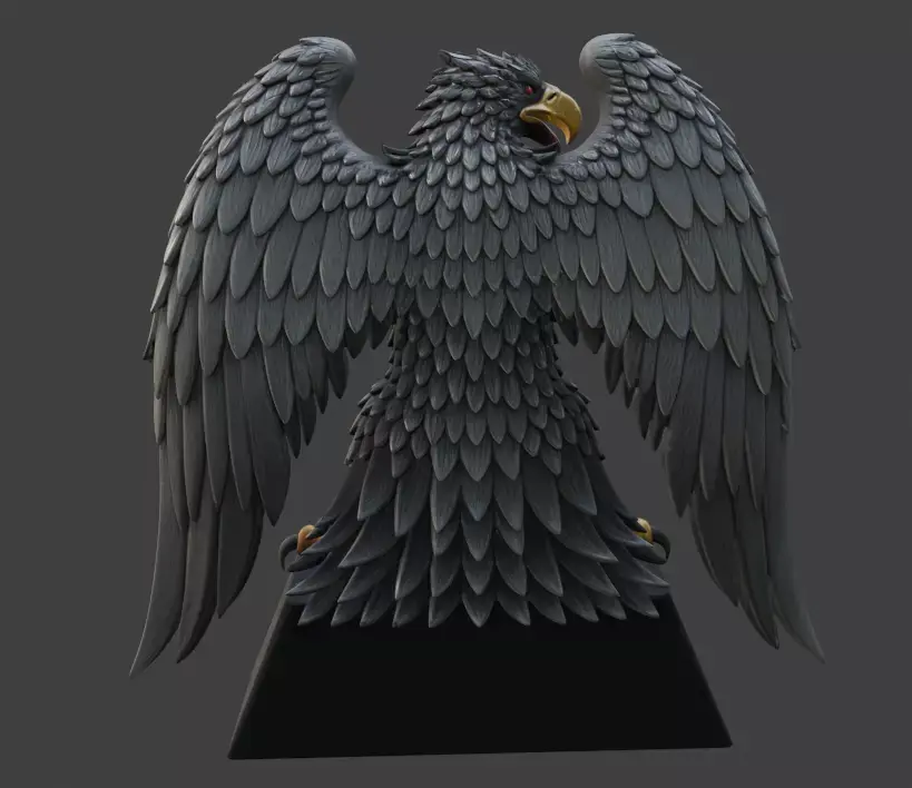 This striking 3D model features a menacing eagle with outstretched wings, clutching a shield adorned with a bold red symbol. The eagle's fierce expression, detailed feathers, and glowing red eyes are complemented by a sturdy base marked with a prominent red H. Perfect for Halloween-themed decorations or fantasy art projects, this model combines gothic elegance with a touch of horror.