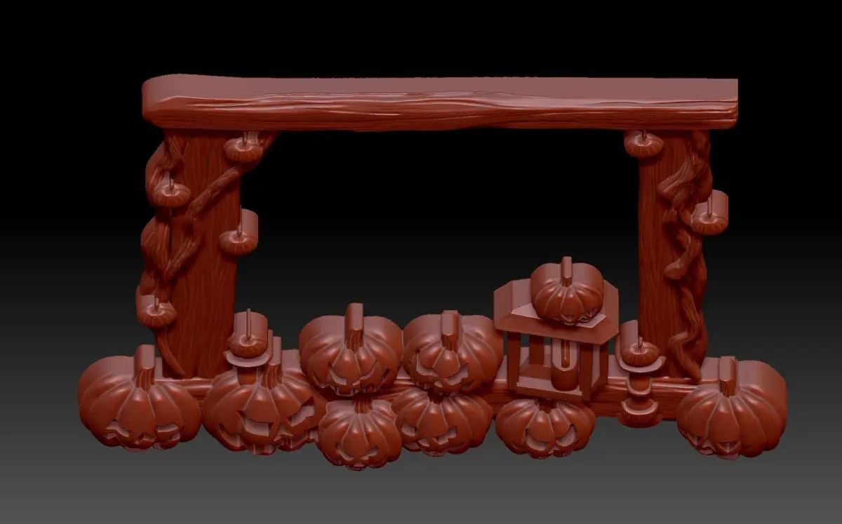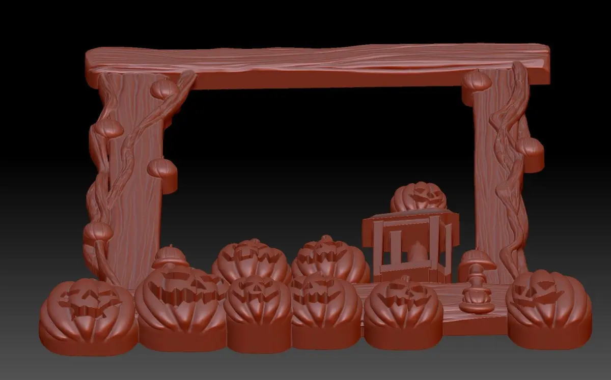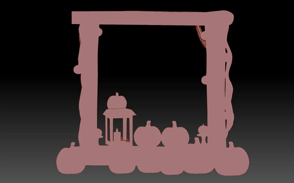 a 3D model of a frame for the Halloween holiday. Featuring the attributes of this holiday: a pumpkin with a sinister face, candles, candlesticks and more. This work is designed for 3D printing and CNC machine tools.