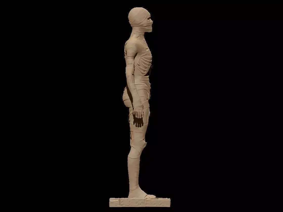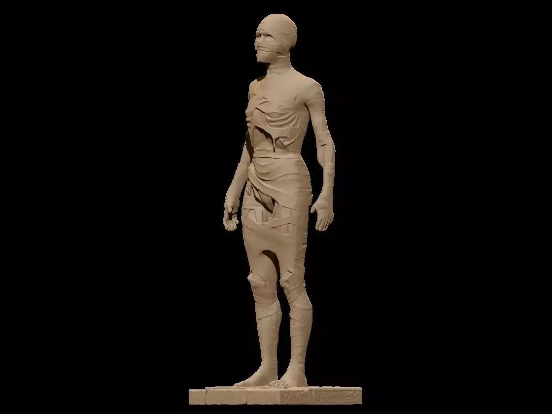 This 3D model features a terrifying undead creature wrapped in decaying bandages, exposing skeletal details and ribs for a truly gruesome effect. Standing on a stone-textured base, this figure captures the essence of an ancient curse.