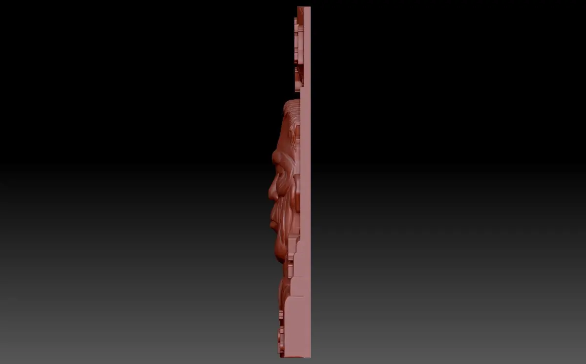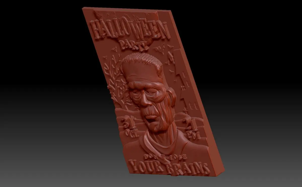 A 3D model of a Halloween-themed bas-relief depicting Frankenstein. The model also depicts the attributes of the holiday - a bat, the moon, an abandoned house and an old tree.