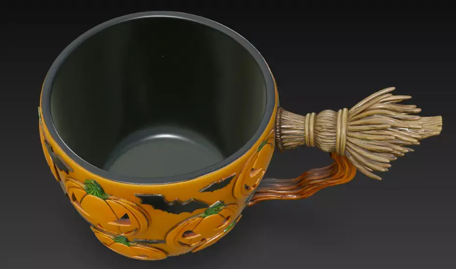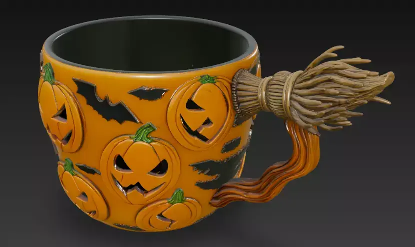 This intricately designed Halloween cup features a dark, matte finish with glowing jack-o'-lantern faces carved into its surface, creating a festive and eerie ambiance. The handle, shaped like a twisted branch with a small pumpkin accent, adds to its whimsical yet spooky charm, making it a perfect addition to your Halloween decor or a unique beverage holder.