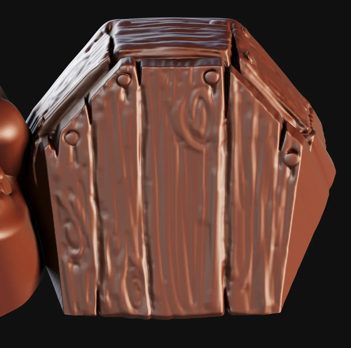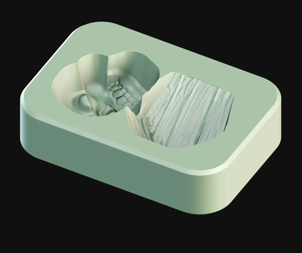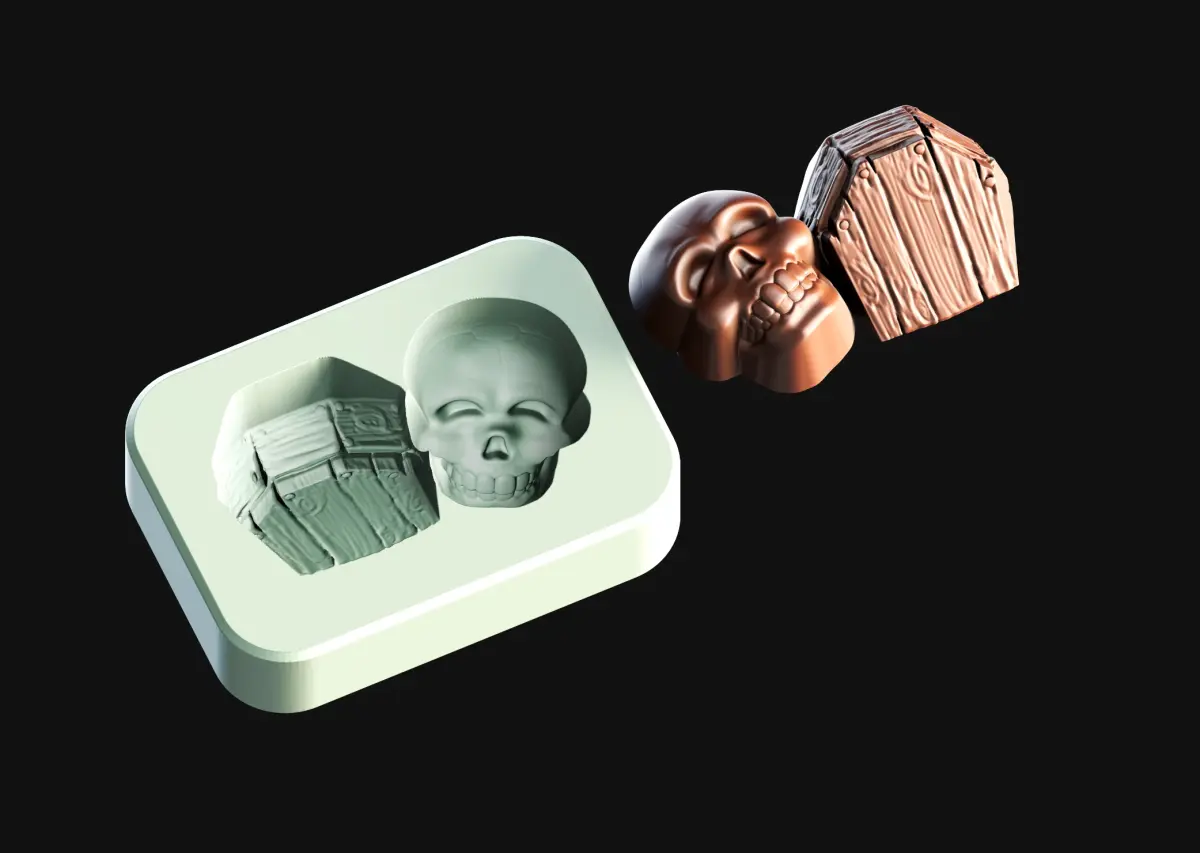 This 3D printable chocolate mold features a grinning skull resting next to a coffin , perfect for creating spooky treats.