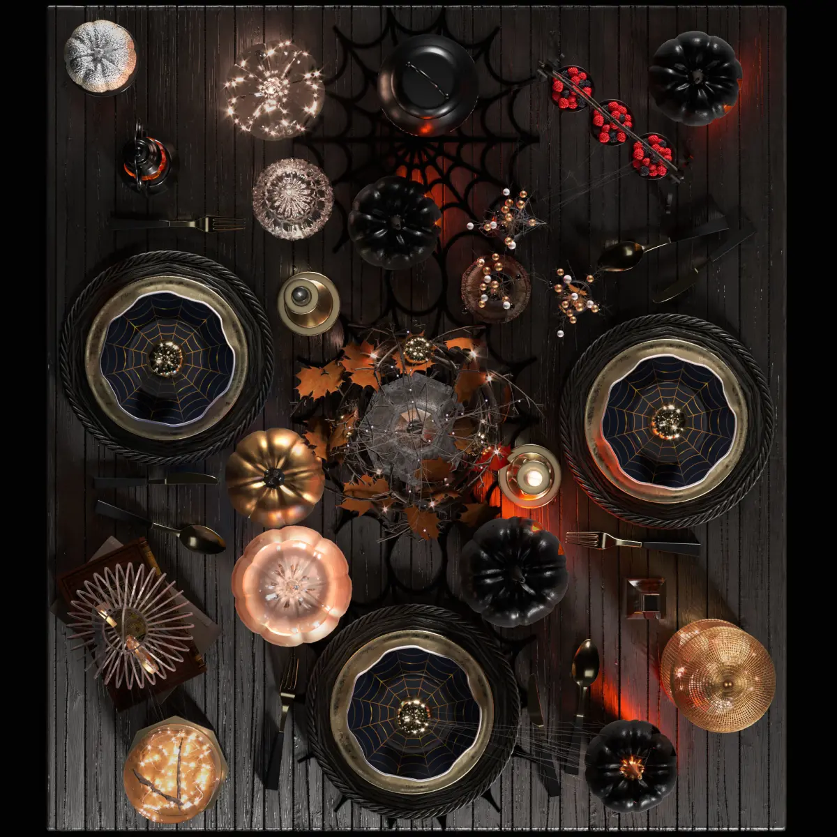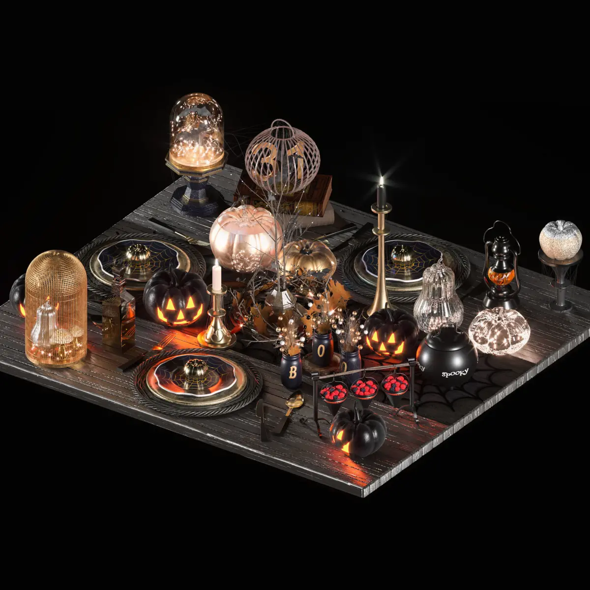 A complete table setting for holloween holiday :)in this model you can have every thing about halloween decorpumpkin - Mushrooms-Bat-Oil lamps-boo decor-Raspberry-autumnleaf-Spider's webdark and scary objectsfiles: 3dsmax 2015render: corona-vrayfbx: corona-vraypoly:1,639,928vertex:1,545,565