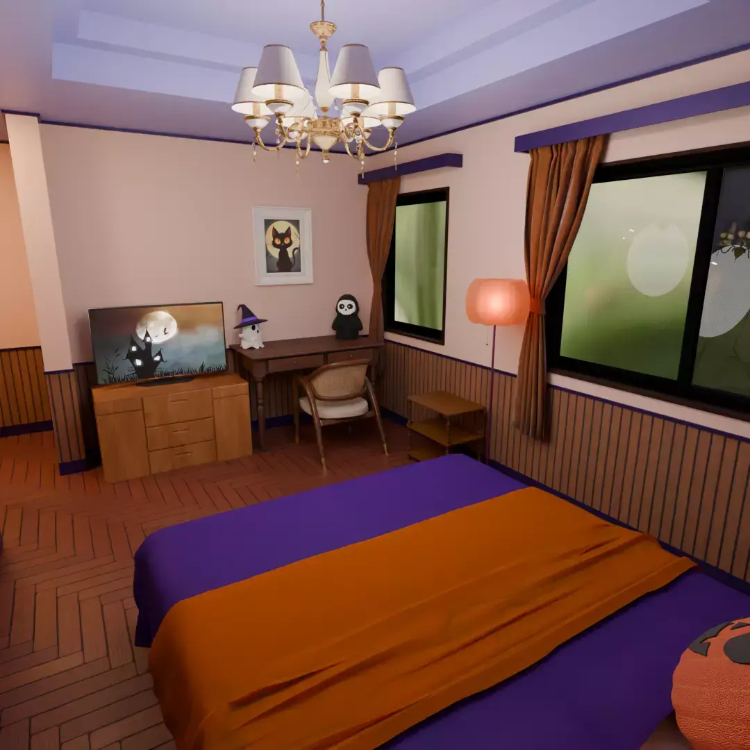 This product is a 3D model of a “Halloween-concept hotel room” created in Blender.Based on a classic hotel room, it features seasonal Halloween designs like pumpkin lamps, jack-o'-lanterns, and a mummy man door.