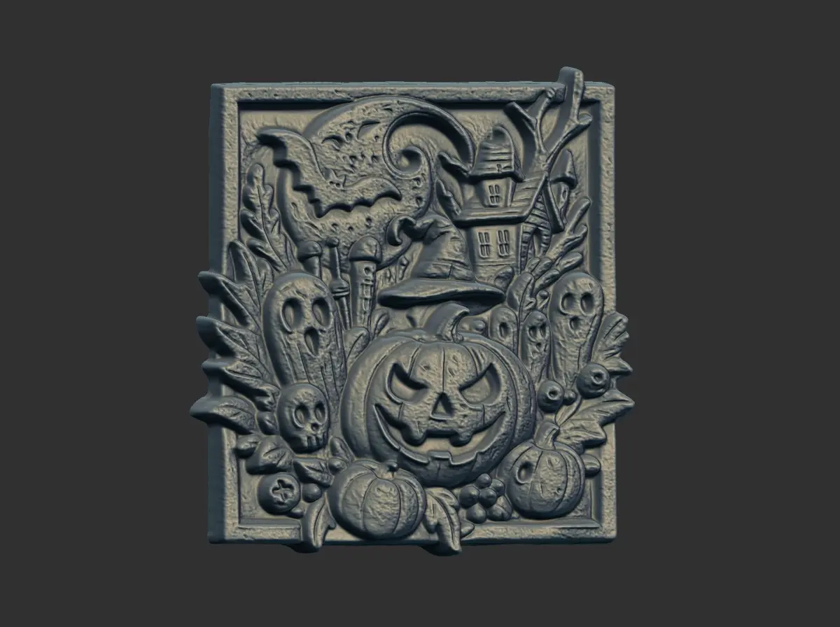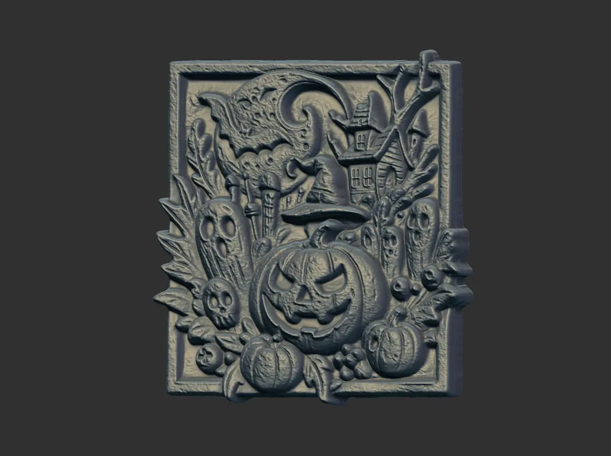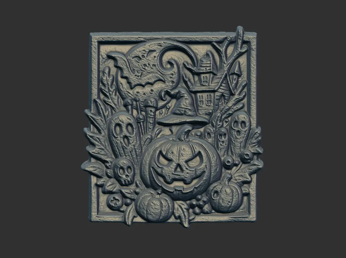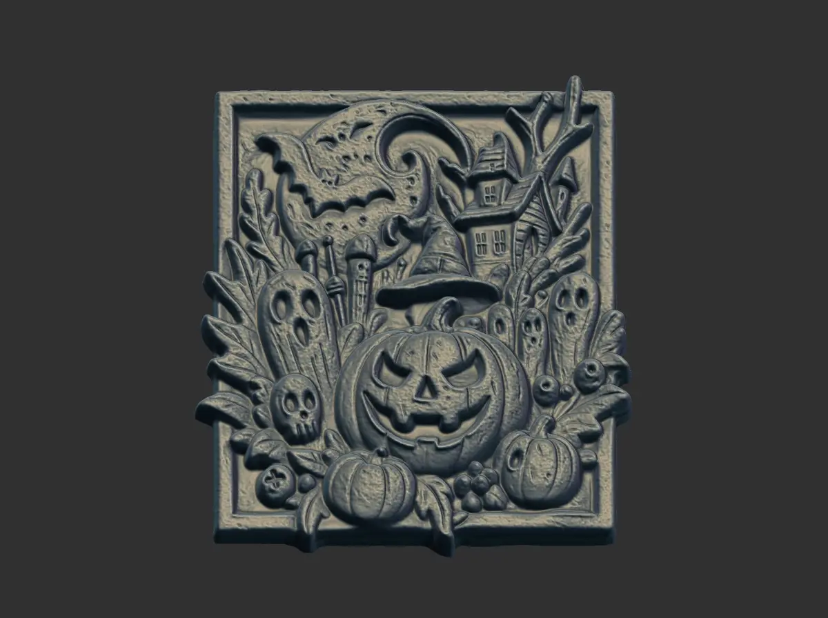 The image shows a gray-toned, rectangular bas-relief sculpture depicting a Halloween-themed scene. The central focus is a large, grinning jack-o'-lantern wearing a witch's hat. Surrounding the pumpkin are several other Halloween-related elements, including smaller pumpkins, ghosts, a skull, and a spooky house silhouetted against a moonlit sky. The entire composition is framed by foliage, adding to the eerie atmosphere. The bas-relief style gives the image a three-dimensional quality, enhancing the depth and texture of the scene.