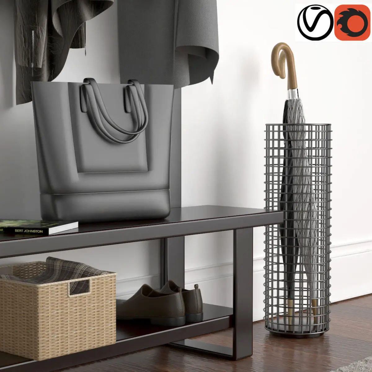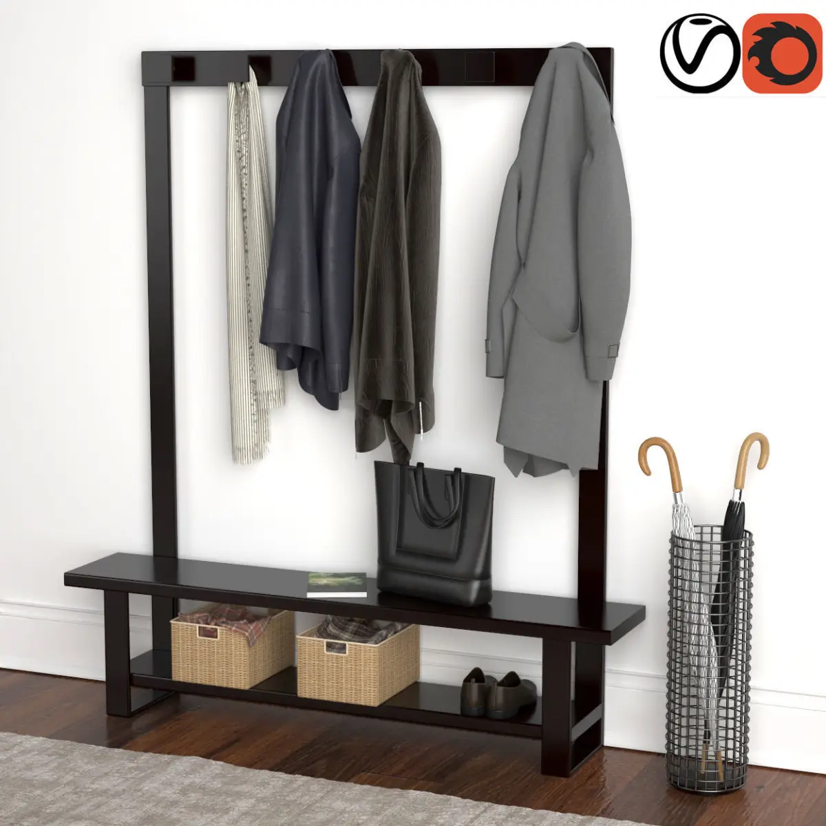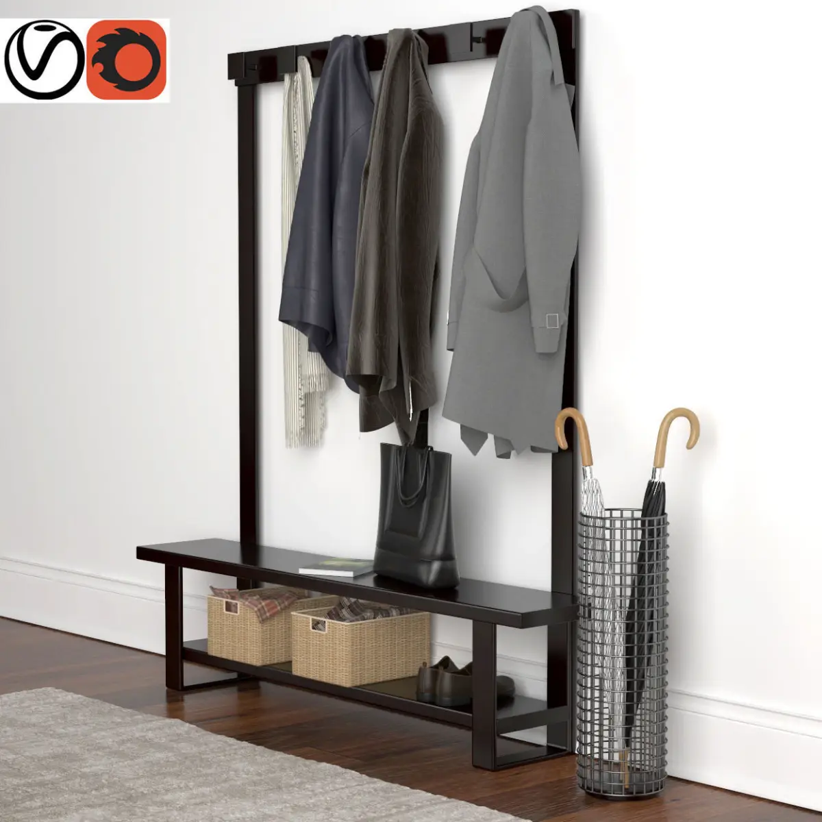 Hallway coat rack with clothes hanging 3D model