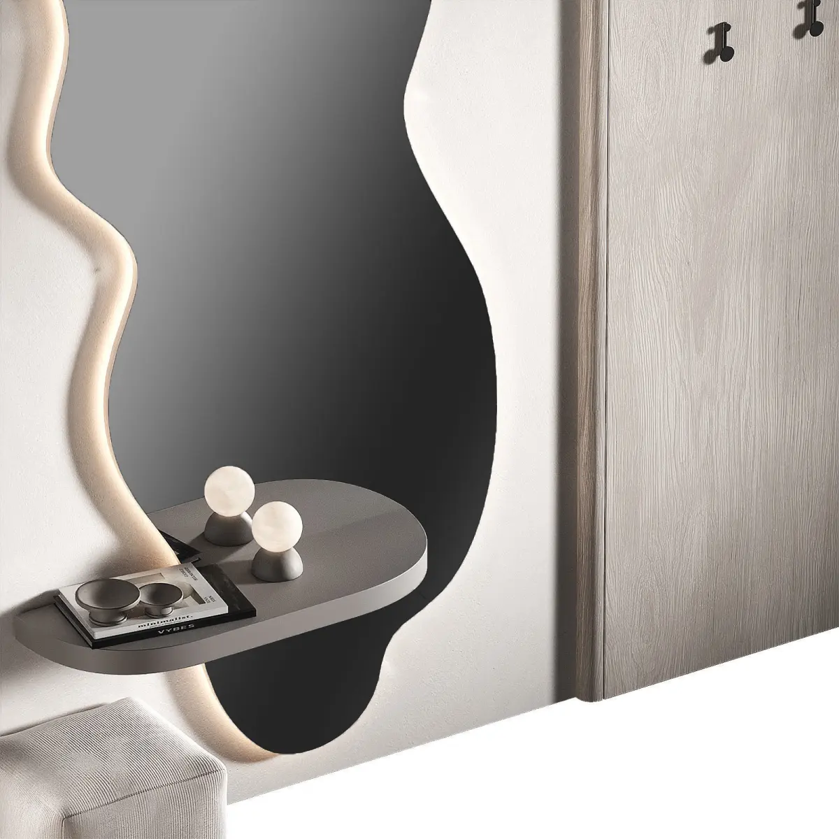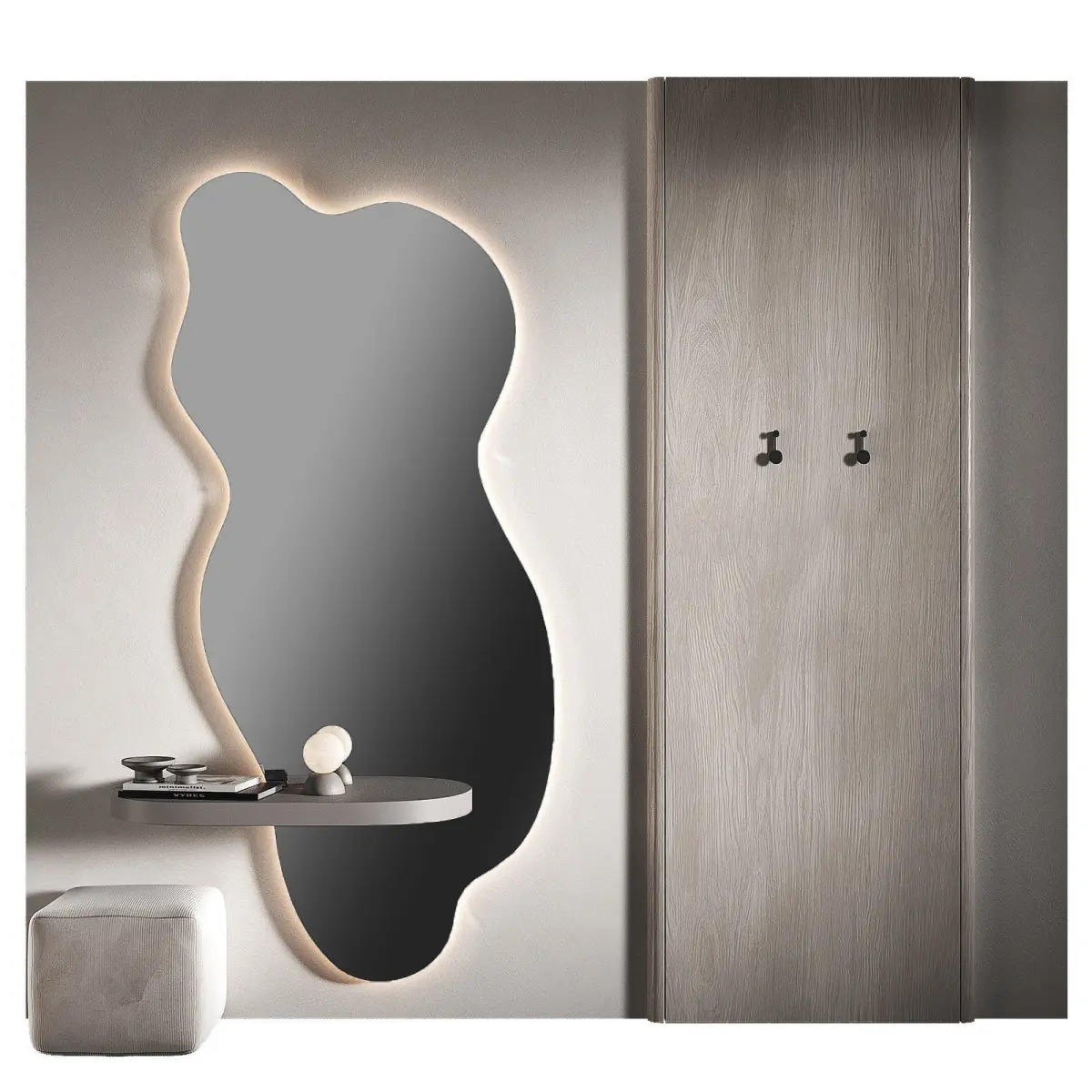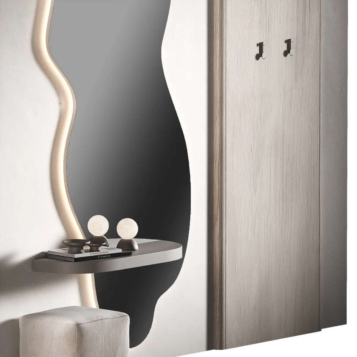 The 3D model contains a set of furniture for the hallway. A hanging console with a large curved mirror of smooth shape, a soft square pouf, hangers, hooks for clothes.