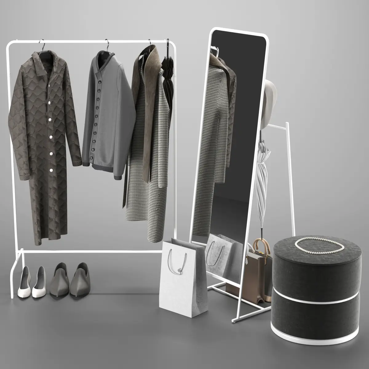 - filling: clothes, bags, hat, umbrella, shoes.