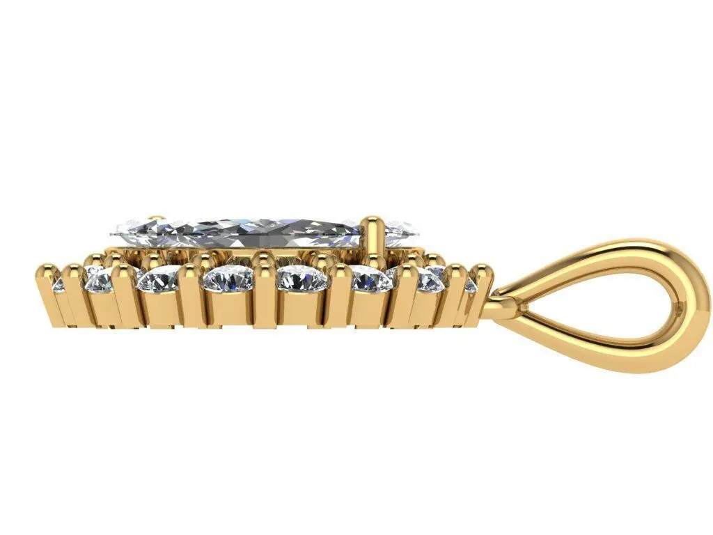This exquisite halo pendant showcases a stunning arrangement of five marquise diamonds, artfully arranged to create a captivating floral-inspired design. Each tapered marquise stone is encircled by a shimmering halo of micro-pave accents, enhancing their brilliance and creating a dazzling display of light. Crafted for those who appreciate bold sophistication, this pendant combines geometric elegance with romantic sparkle. The marquise diamonds’ elongated shape elongates the neckline, while the surrounding halos add depth and dimension. Perfect as a statement piece for special occasions or an everyday touch of luxury.