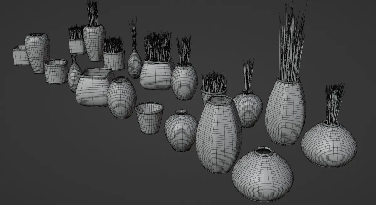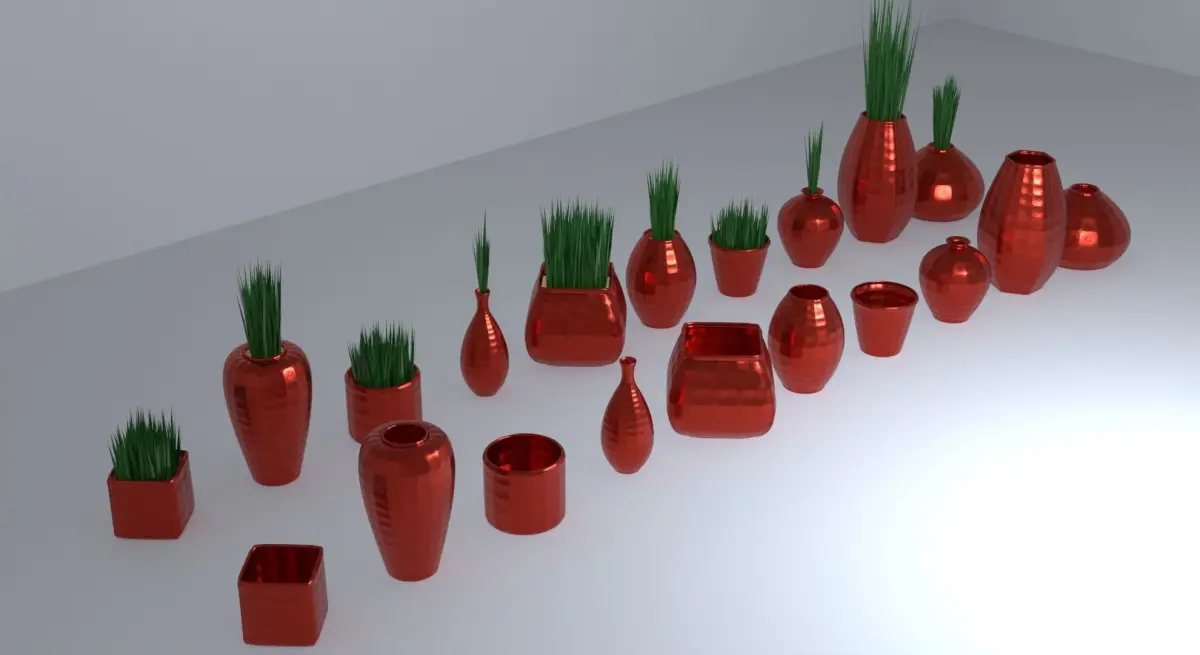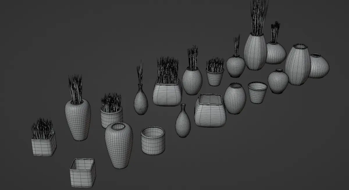 A collection of Hammered Copper Pots. You have access to empty pots, and also to pots with a simple plant inside. Perfect to decorate easily and fast a place, since all these pots have a matching style. Currently trending in a lot of place, that's perfect for a scene !